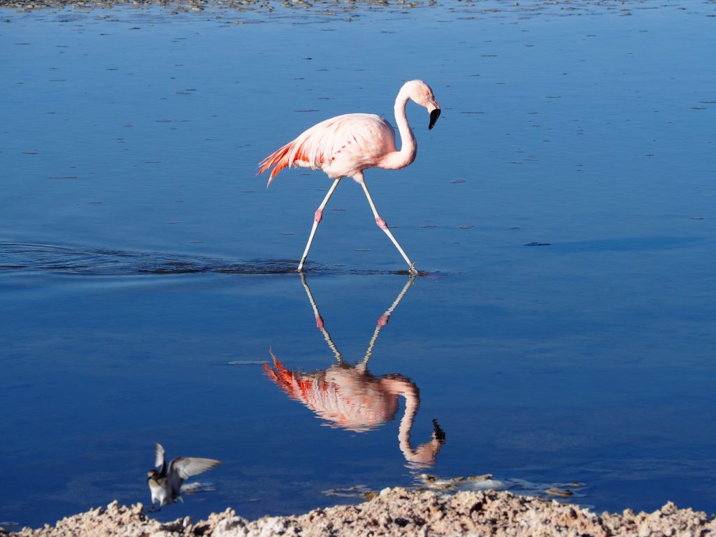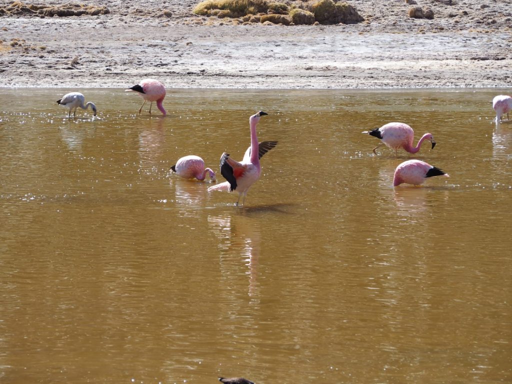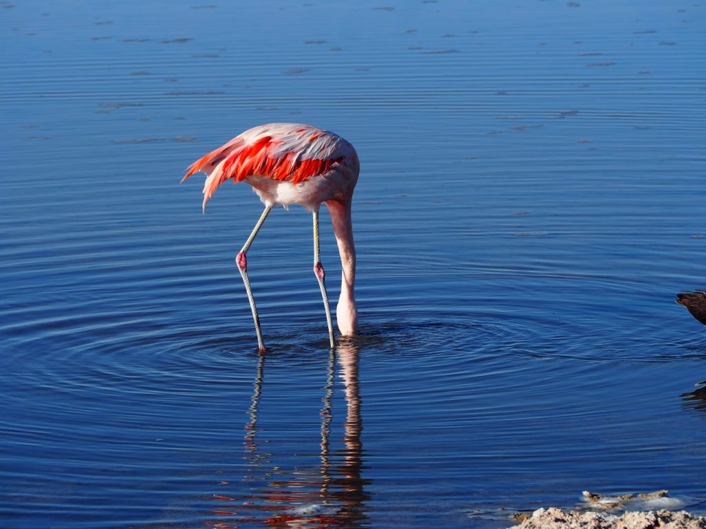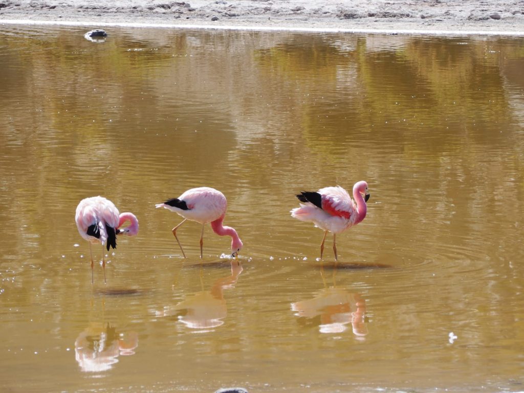 We were really fortunate on this tour in that only 4 people were booked on (including ourselves), so with two other companions plus guide we headed off in a 4×4 pickup truck for a full day of what was promised to be the best tour of all. We were not disappointed. First stop was Laguna Chaxa for our first sight of flamingos. There are two types of flamingo at this lagoon: Chilean, which have pink knees and “dance” to disturb the shrimps lurking in mud, which are their staple food; and Andean, which have some black feathers on their backs, and which stand still when feeding but scrunch the mud with their toes to disturb the shrimps. We had a fantastic close-up view of a Chilean flamingo. Sadly, most of the rest of them were feeding on the far side of the lagoon.