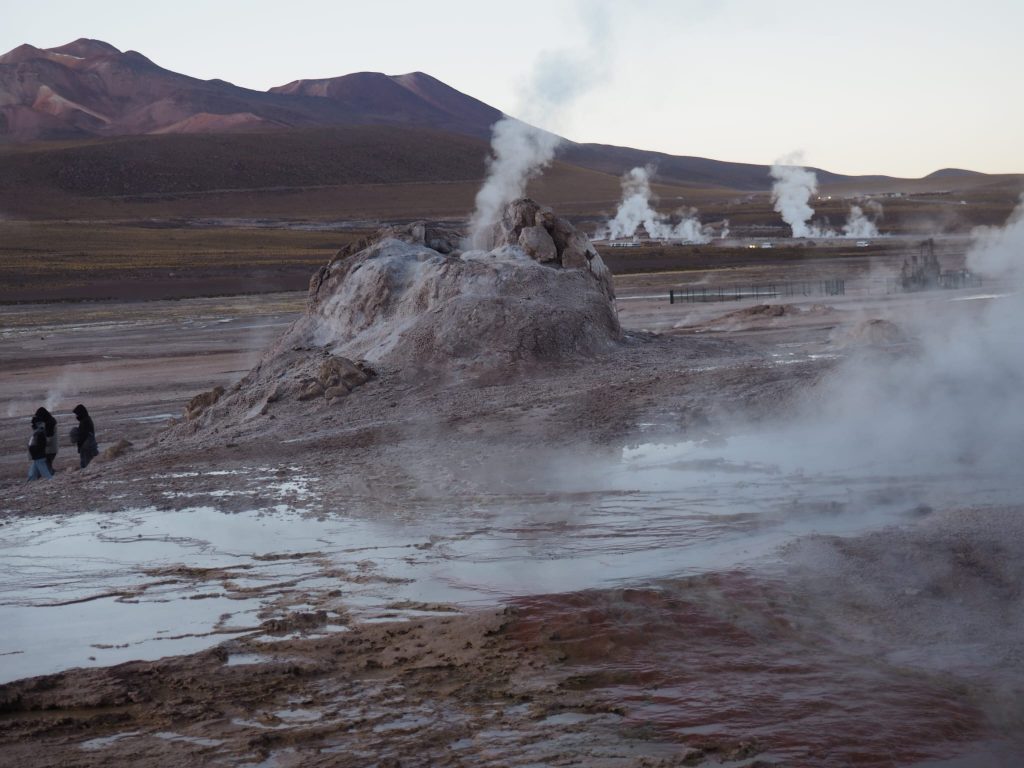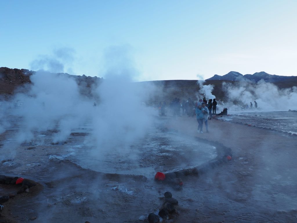 Our final day in San Pedro was also the day of our final tour – the Geysers del Tatio tour (del Tatio is the name of the volcano that is the Geysers’ source). With an extremely early start and warnings to be well wrapped up, we headed out on the hour plus journey in the pitch black and very cold hours of pre-dawn. The arrival at the geysers worth the early start. Just as the dawn was breaking the steam was billowing eerily into the sky from the ground. At minus 6 degrees, we didn’t stand still for too long at each stop, but the guide gave us an insight into different types of geysers – conical and cyclical – allowing us to experiencing first-hand the sight of water bubbling up from the earth, accompanied by a sound not dissimilar to multiple giant kettles boiling.