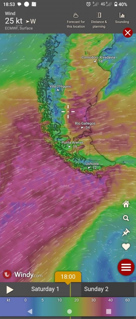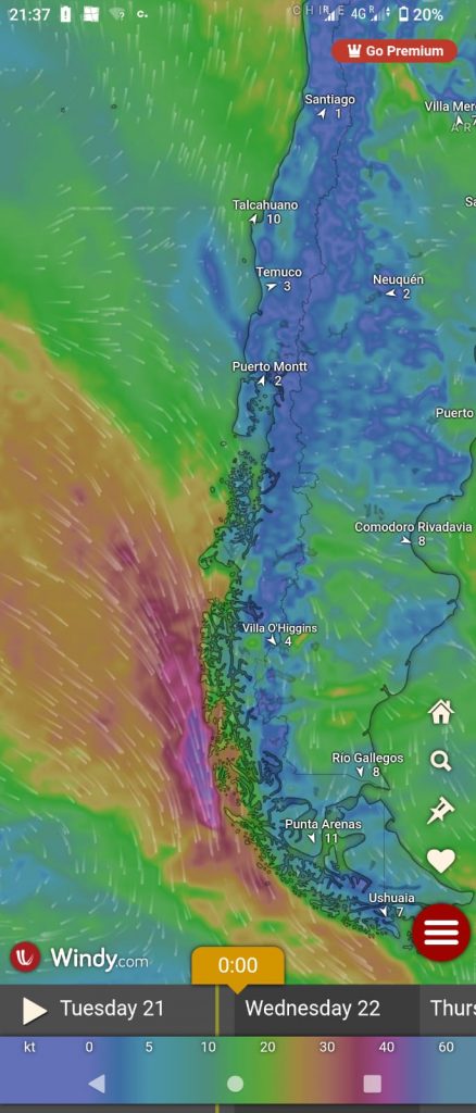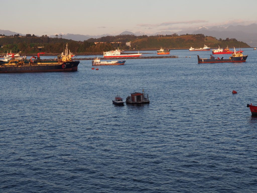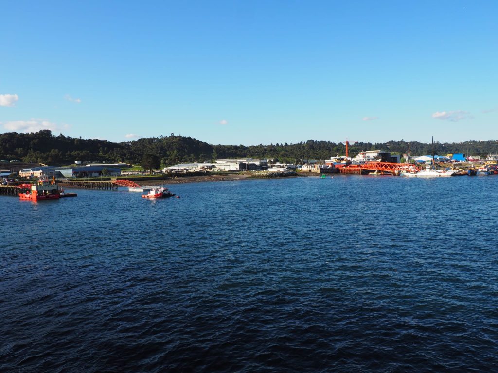 We hadn’t assumed it would all be plain sailing (sorry, but…..). After confirming for the 17th Oct ferry there was a delay in payment (thanks Santander!). When the ticket arrived it gave sailing as 21st October. Much emailing elicited that a technical fault had delayed the sailing but it would definitely be fixed and would sail on that departure date. Check-in from 10.30am. At this point, with four days to fill, we headed to Valdivia (see “cloud with the pearl lining”). The 21st arrived, check-in had moved to 16:00 for a 18:00 sailing. We boarded the bus to the ferry, with about 30 other foot passengers. On arriving we explored the cabin, lounge, cafeteria and deck areas. Not much to see, but comfortable enough for three nights. After dinner we were advised that due to bad weather further south, departure was delayed until 12:00 on the 22nd. Our weather app confirmed some significant weather out there and as we had no time constraints we decided to sit it out.