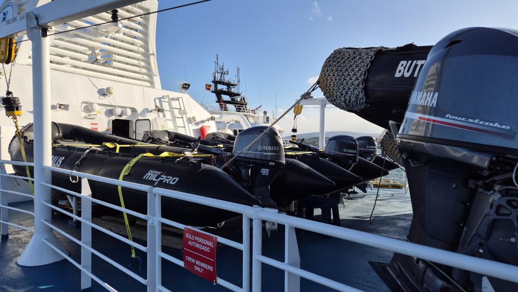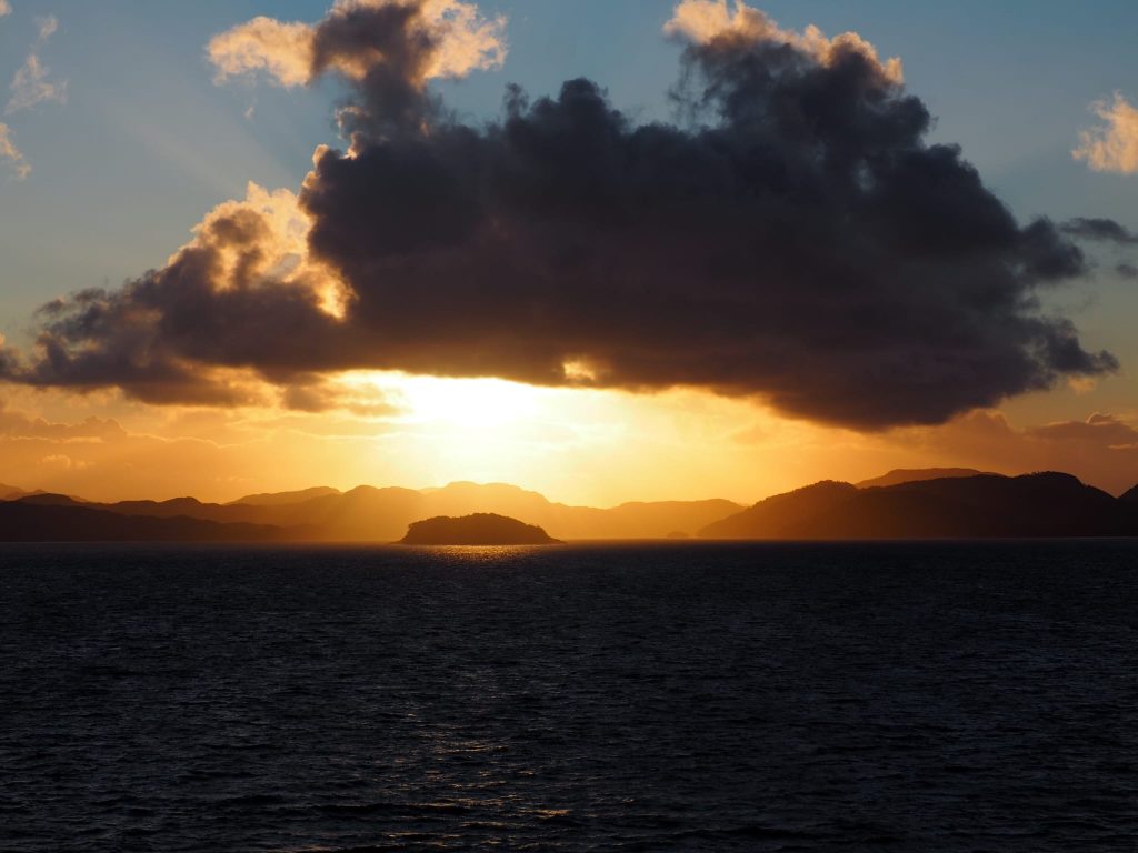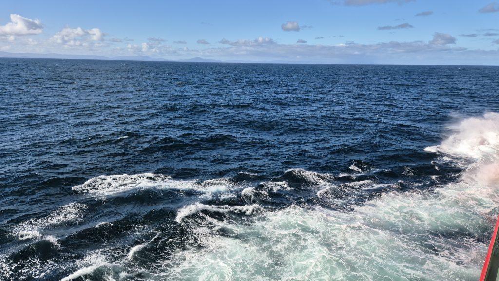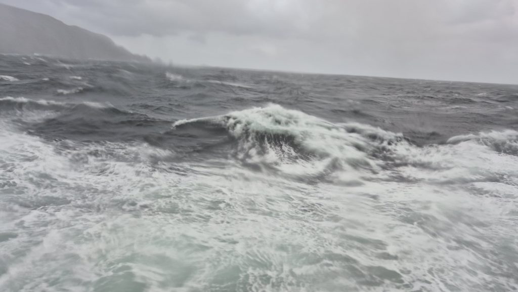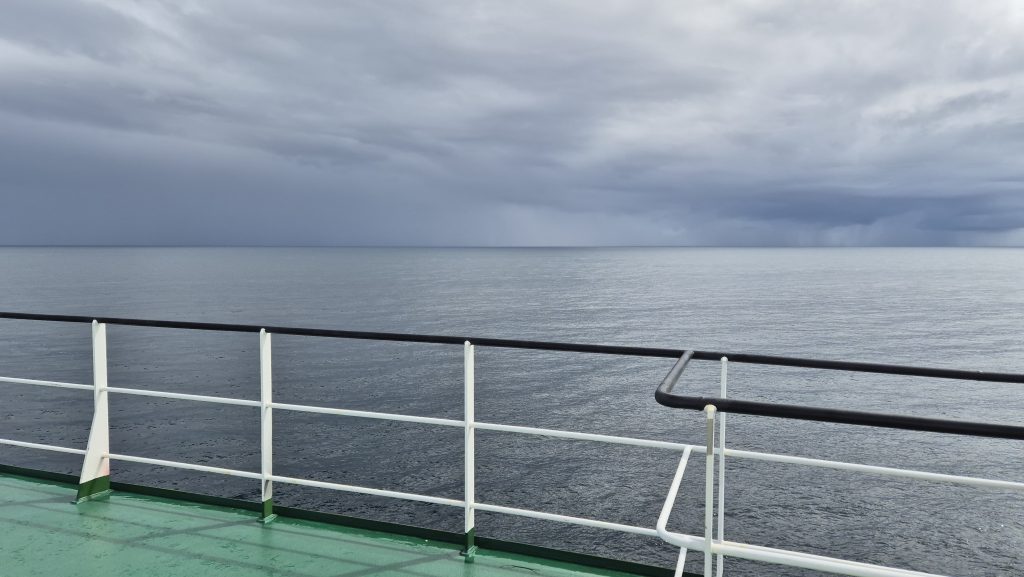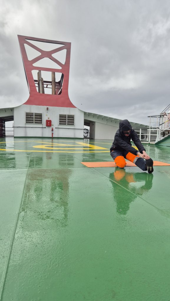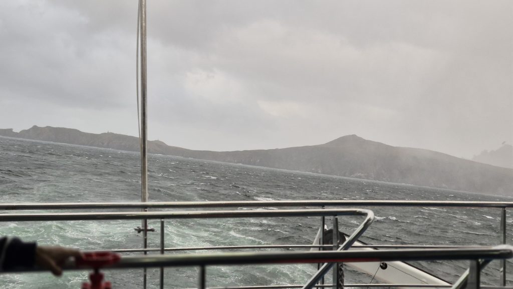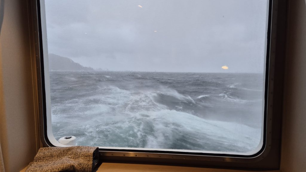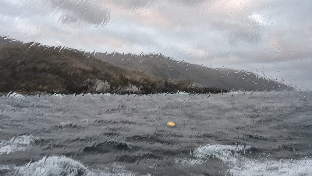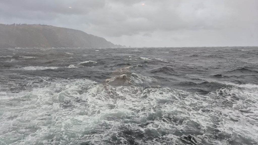 We could tell when we exited the channel. At around 6am we woke to the ship lifting and dropping with much more gusto than it had previously; internal panels creaked, waves banged on the hull, and the wind was definitely significant. The bow deck was now “out of bounds” so we spent much time outside on the back decks enjoying the changeable weather and open sea. And a spot of yoga on deck – in the open, in the rain, with added challenge of the rolling of the ship. The weather varied hugely. One minute squal and the next glorious sunshine, and although the sea was rolling well, it was not as bad as we had been led to expect. Tablets remained untouched.