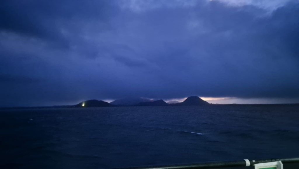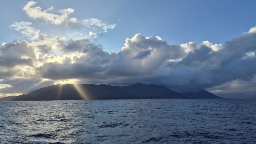 Thursday 23rd dawned with movement. Finally we had sailed at around 6am – a day and a half later than expected and five and a half days later than originally planned. Gliding through grey seas under a grey and often wet sky it was lovely to finally be underway and we spent much time on deck, scanning the sea for elusive whales and dolphins. Seals occasionally, birds aplenty, lots of islands and fantastic cloudscapes, but no whales.