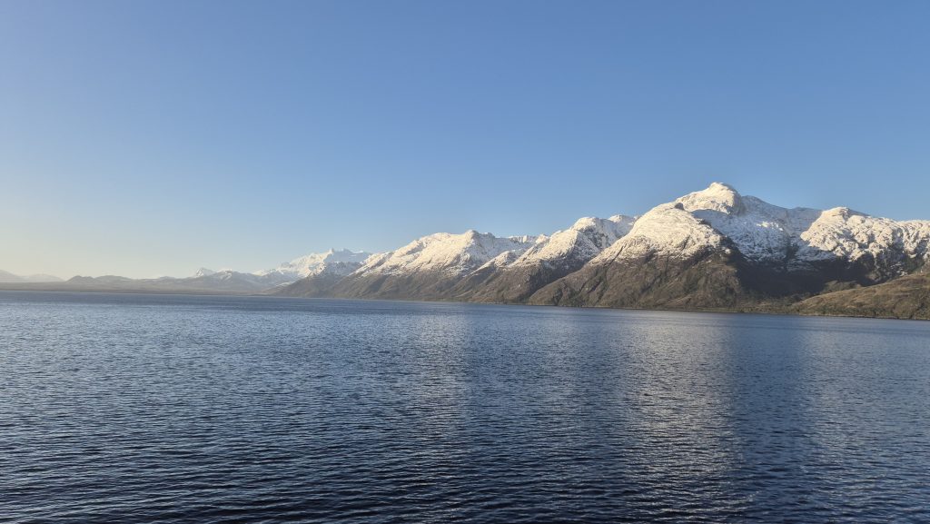 We moored just off Puerto Eden, a tiny hamlet of circa 200, to offload passengers – a family travelling to a project analysing whale movements in the gulf and, it seemed supplies for the local shop. It was a most beautiful spot – coloured houses dotting the stunning scenery of snowcapped mountains. The journey continued with epic scenery, and rapidly changing weather making the view constantly change. It wasn’t difficult to lose the day walking the deck, drinking in the majestic sights all around. This was Pategonia as we had never expect to witness it.