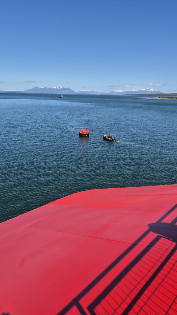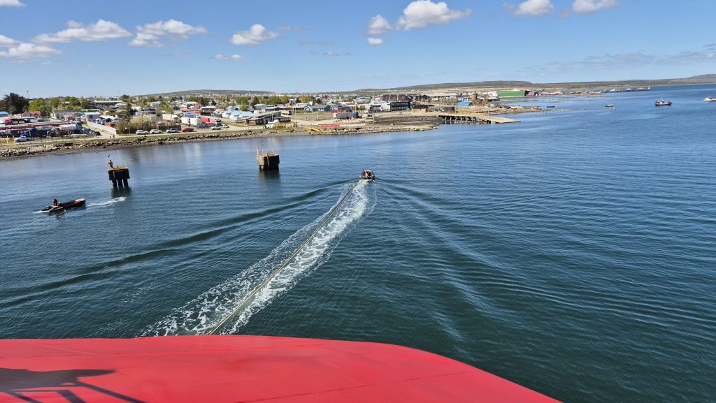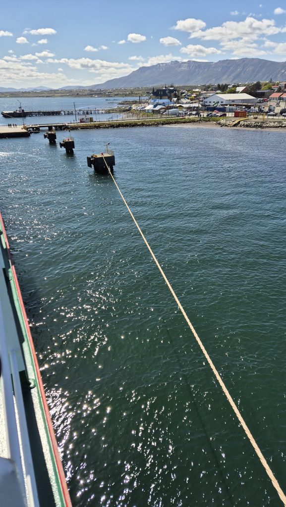 The final day brought us to Puerto Natales. The morning passed with more spectacular scenery, blue skies and bright sunshine. About an hour before Natales we saw our first small boat in three days. Gradually the small city came into view and we witnessed a complex docking procedure involving many ropes. The biggest surprise of all was the pair of dolphins that appeared off the bow for a few seconds before probably decided it was much too noisy and disappearing back into the sea.