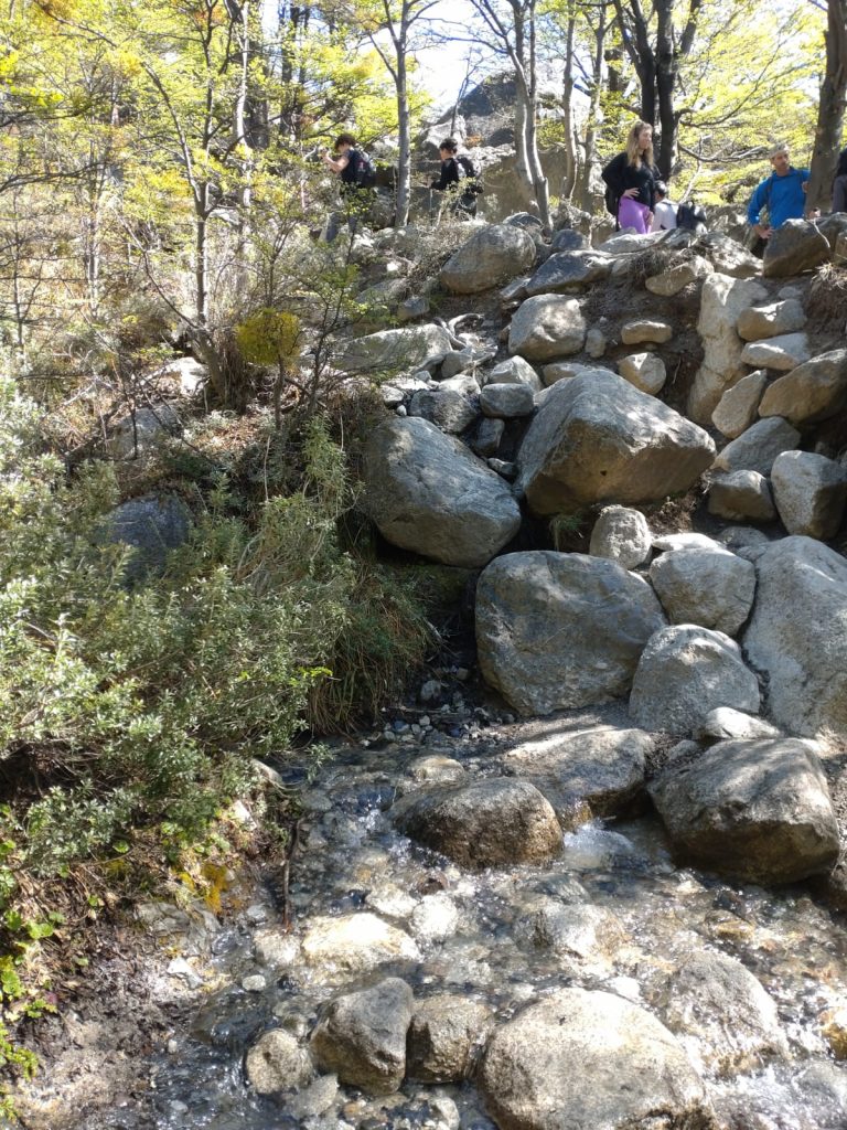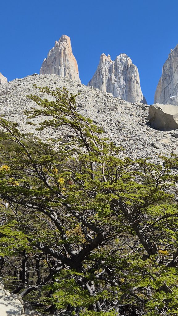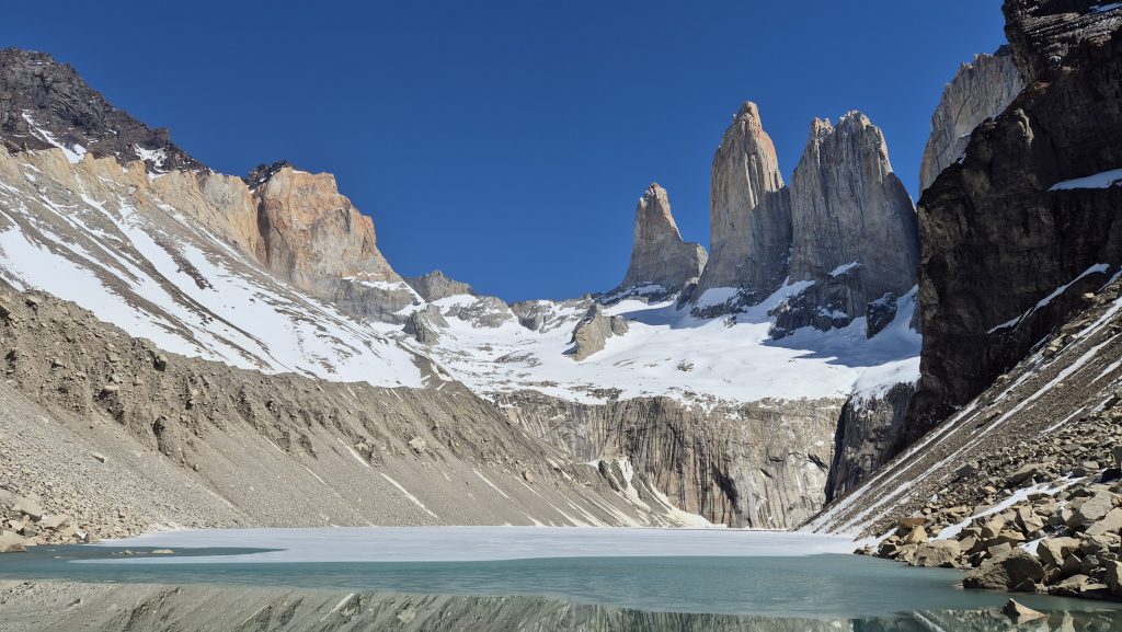 We got to the start at around 8.30am following a 90 minute drive. A glorious day with blue skies, no cloud and no wind (all of which are quite rare); it was already pretty busy. A 20 minute flat easy walk brought us to the first part of the trek, a relatively comfortable steady climb over a well marked rocky path for about 2 hours. After a brief rest and sugar fix at a refugio (where we saw horses bringing supplies – beer kegs, soft drinks etc – for the cafe and campsite there) we continued along an attractive wooded section for an hour or so. We then reached the part where Tommy, our guide, advised we should “take time, go at our own pace, and just get there safely!” We soon realised why – this was less of a walk and more of a scramble up rocks, largely up the bed of a small stream for about 1 hour. Each time we thought we were getting there it just climbed further. Finally, about 10 minutes after crossing the snow line, we turned a corner to the most fabulous scenery at the base of the Torres (towers). Words can’t convey so the photos will have to try and do it justice.