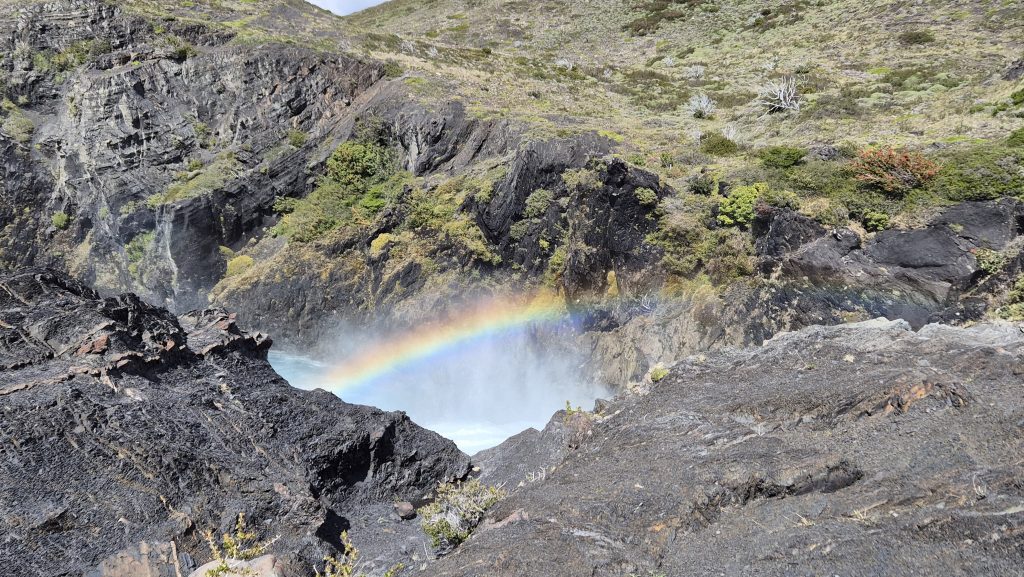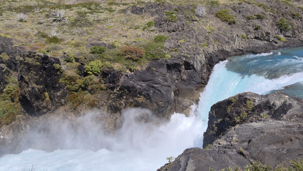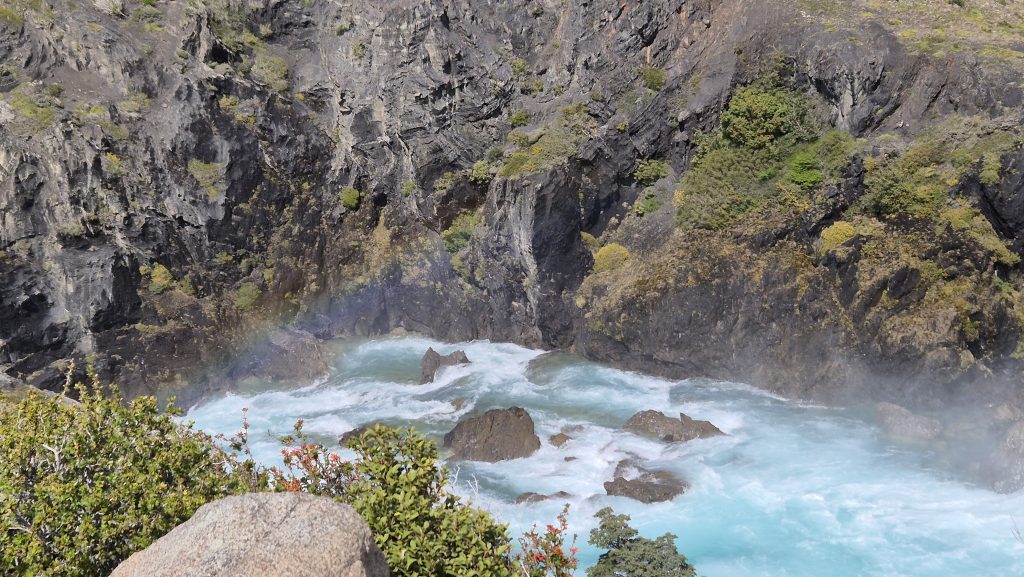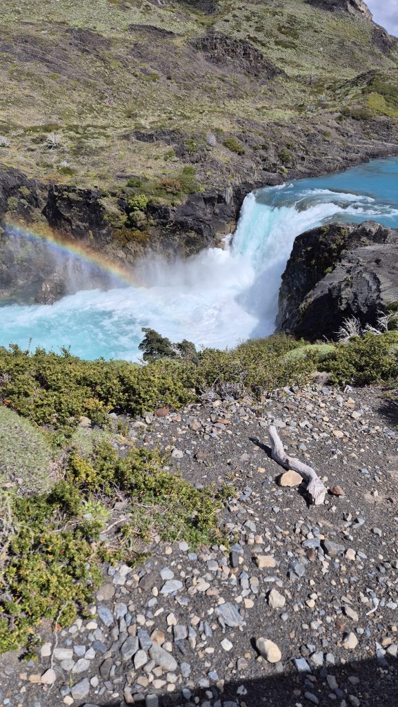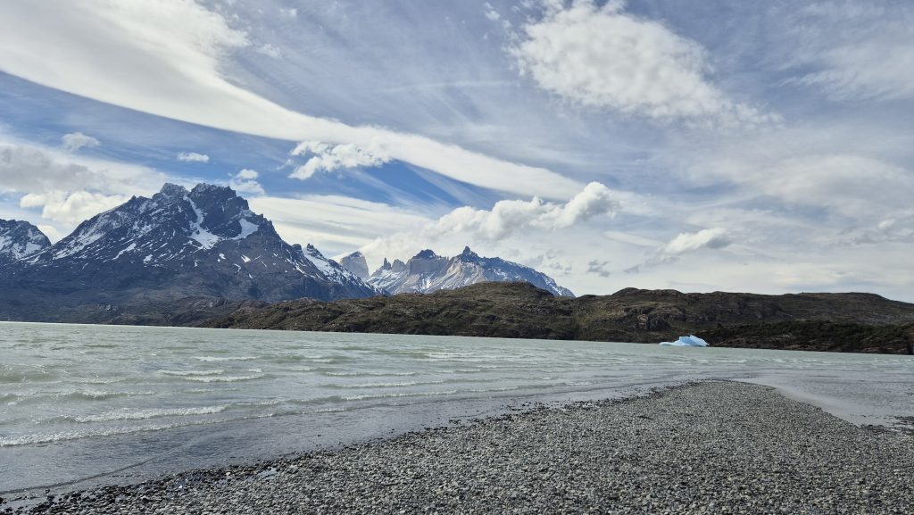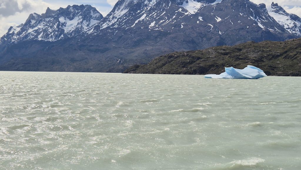 A couple of days later, we had a full day of travelling around the national park, this time by minibus. First visiting Milodon (disc. 1895) where the remains of prehistoric animals were found, including a previously unknown creature eventually categorised as a giant sloth. Then around many of the lakes dotted at the base of the mountains and via a couple of very picturesque waterfalls. The final stop was at Lago Gris (Grey lake) where we battled along the beach, against the incredible wind funneling down the lake, to catch a glimpse of Glacier Gris several miles away at the other end and to see the small dragon shaped iceberg that had floated down the lake to rest at the beach end. Another day where the pictures will say more than words.