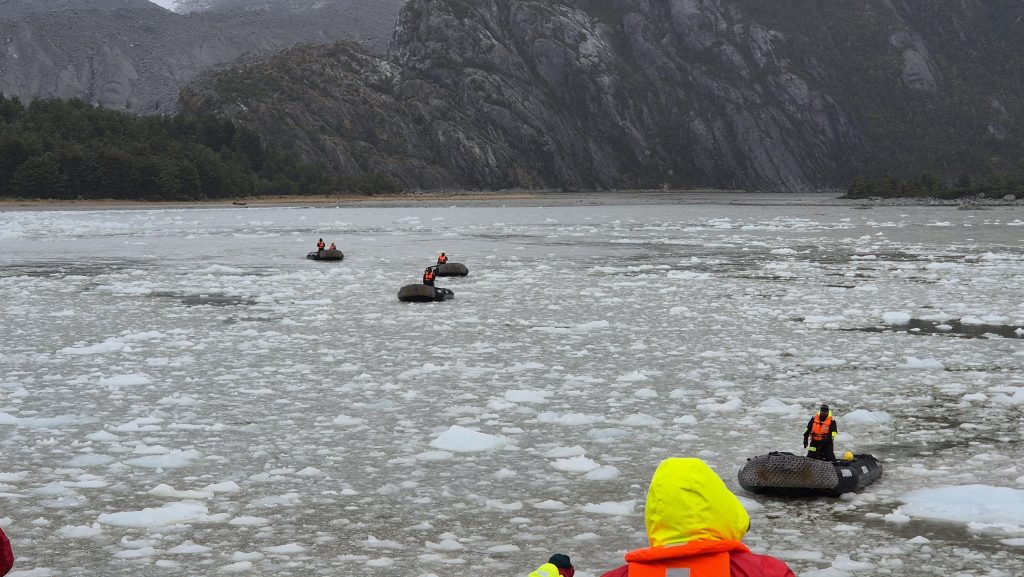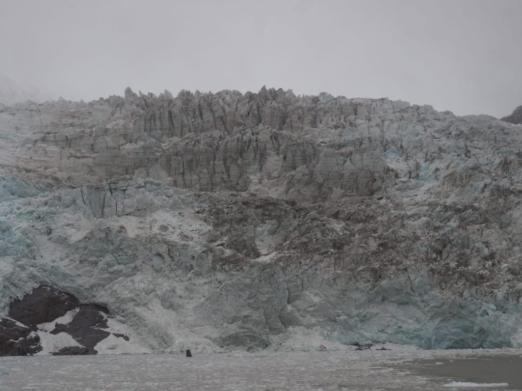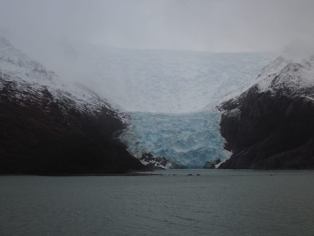 The afternoon trip was to be a visit to the Tucker Islets to see (hopefully) penguins and other sea birds. Sadly, however, the Patagonian weather dictated otherwise and the captain decided it was unsafe to use the RIBs with winds gusting upto 50 knots. A trip the following morning, as a “bonus trip” to see the Porter Glacier was organised, although we were not able to disembark for this one. The three RIBs on the first tranche bounced down the bay for about 15 minutes through the ever present weather, relatively benign when we had boarded, it changed massively as a hail squall blew in. The glacier remained impressive despite.