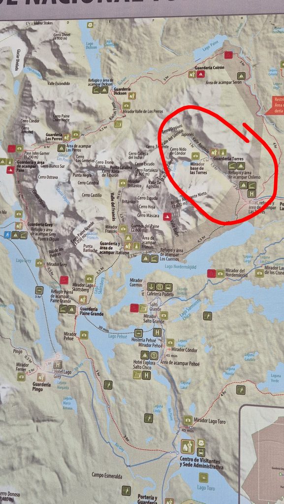 Whilst on the ferry we made friends with an Australian couple, also staying in Puerto Natales for a few nights. As our homestay hosts were also tour guides we decided to all book a guided trek to the Base of Torres del Paine national park, encompassing mountains, glaciers, lakes and rivers of Pategonia and that is a very popular treking destination for people from all over the world. The trek we chose is a leg of the ‘W route’ – a trek of 50km undertaken over three days. Our leg is the longest section – 22km with an elavation of around 840m, and is known for being ‘challenging’.