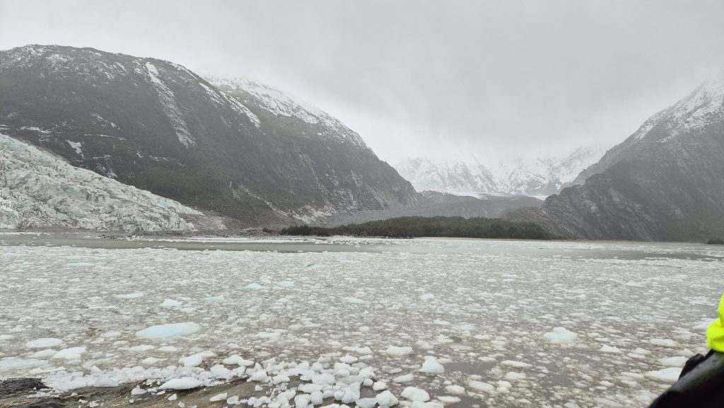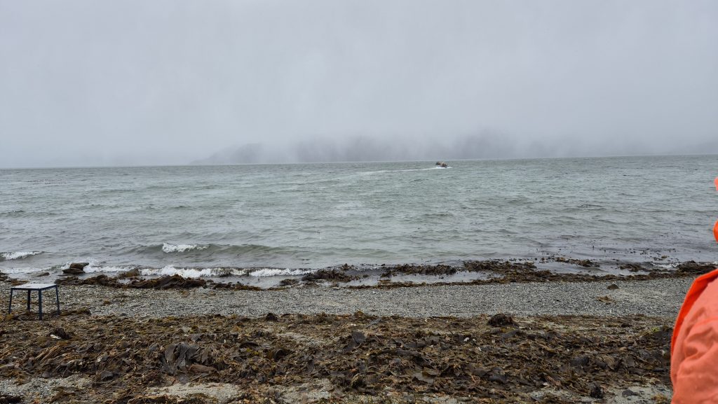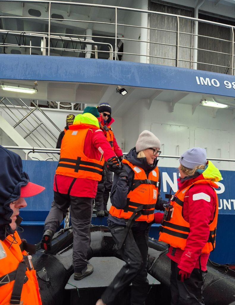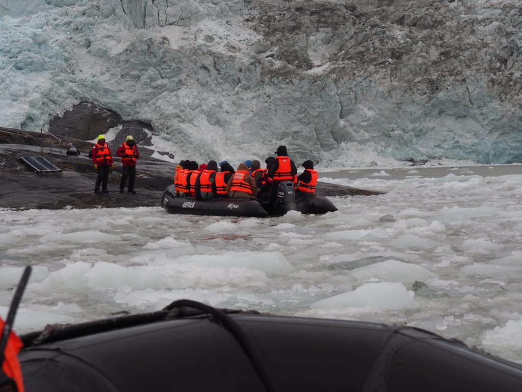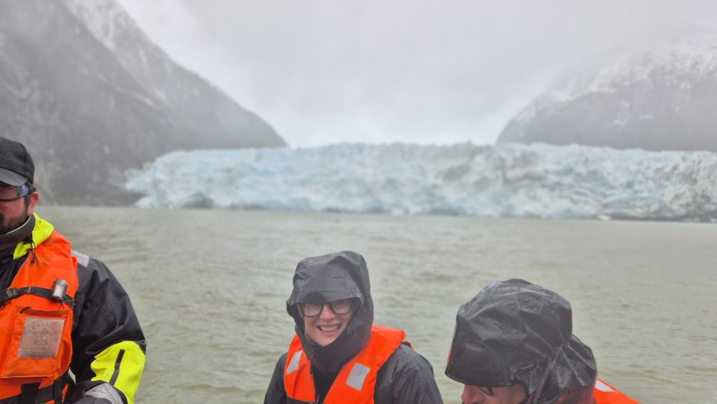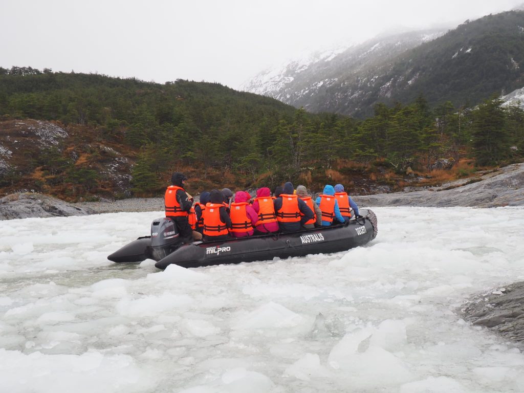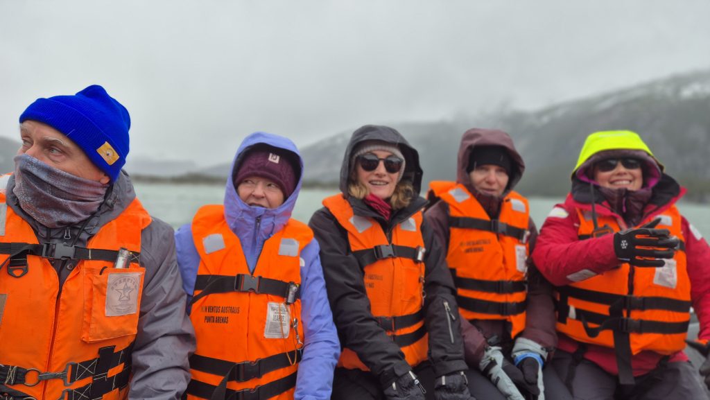 Despite the Windy weather app showing very strong winds on the west coast, the initial journey would take us through calmer fjords between the islands. We sailed promptly at 8pm as scheduled. After a peaceful night we woke early to views through snow, sleet, hail and sunshine before being given our instructions for the first excursion – across Ainsworth Bay. Boarding the RIBs from the bottom deck of the boat and again at the shore line was an exciting experience but never felt unsafe. The ride across Ainsworth Bay was cold, wet and exhilirating. After a hike up Ainsworth Moraine at the end of a glacial moraine, we had fabulous views of the Almirantazgo Fjord – again, with snow, rain, hail and sun, sometimes all at once, and a bitterly cold ever present 30-40 knot wind. It was as fun as it was bracing and on return to ship hot chocolate and whisky was distributed.
