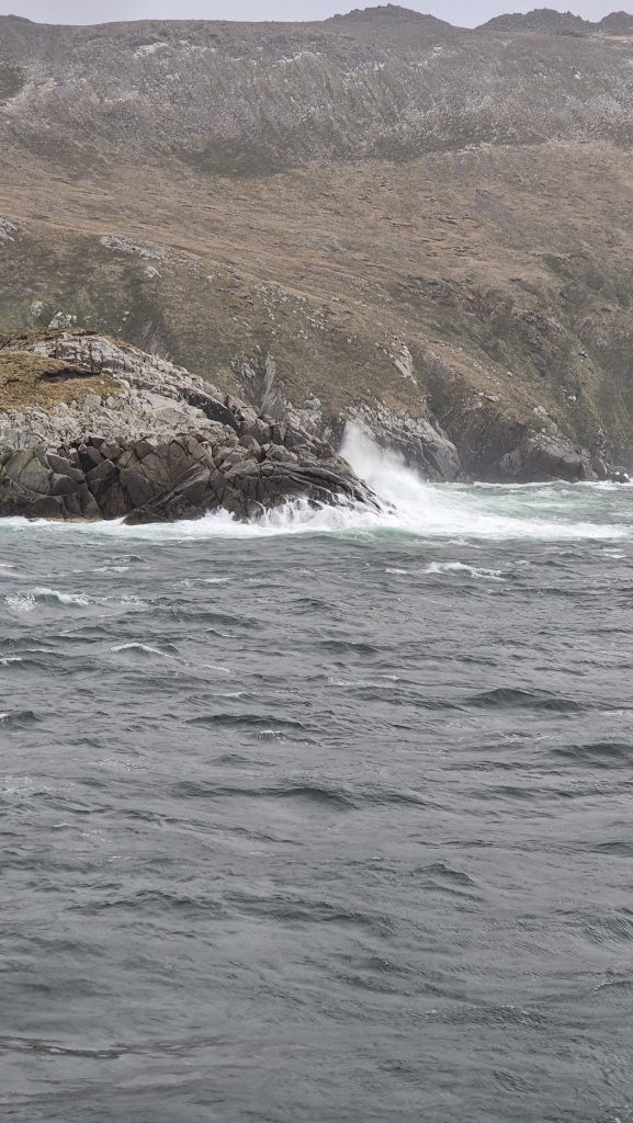 Day 4 took us out to Cape Horn. The sea has not seemed as heavy when we wove through the Hornos Islands. However, once out of their lee we were hit by 50 knot gusting to 70 knot wind and very significant swell, so the planned landing was cancelled. Our consolation was that we reached the seas around it and saw both the lighthouse and monument from a distance.