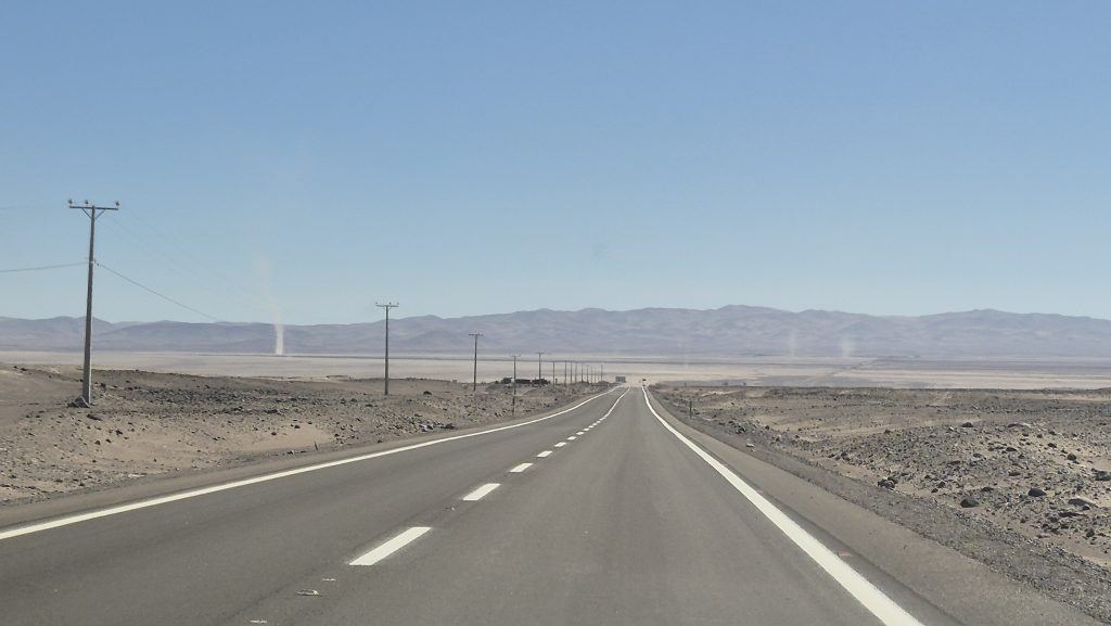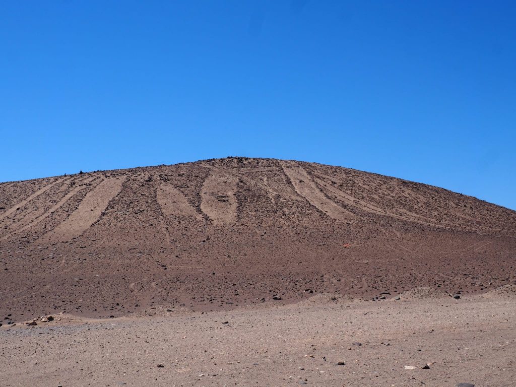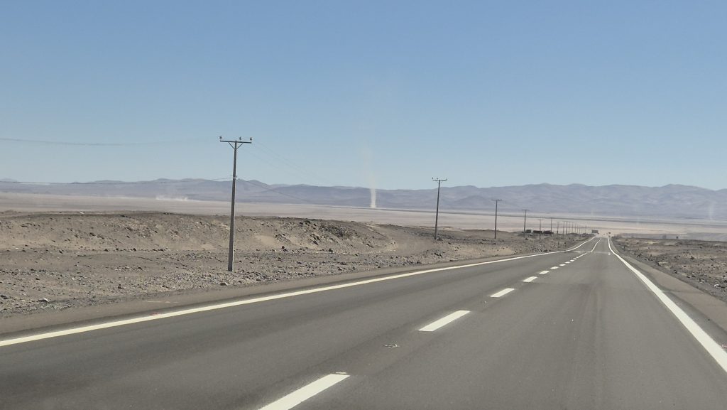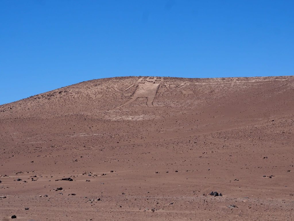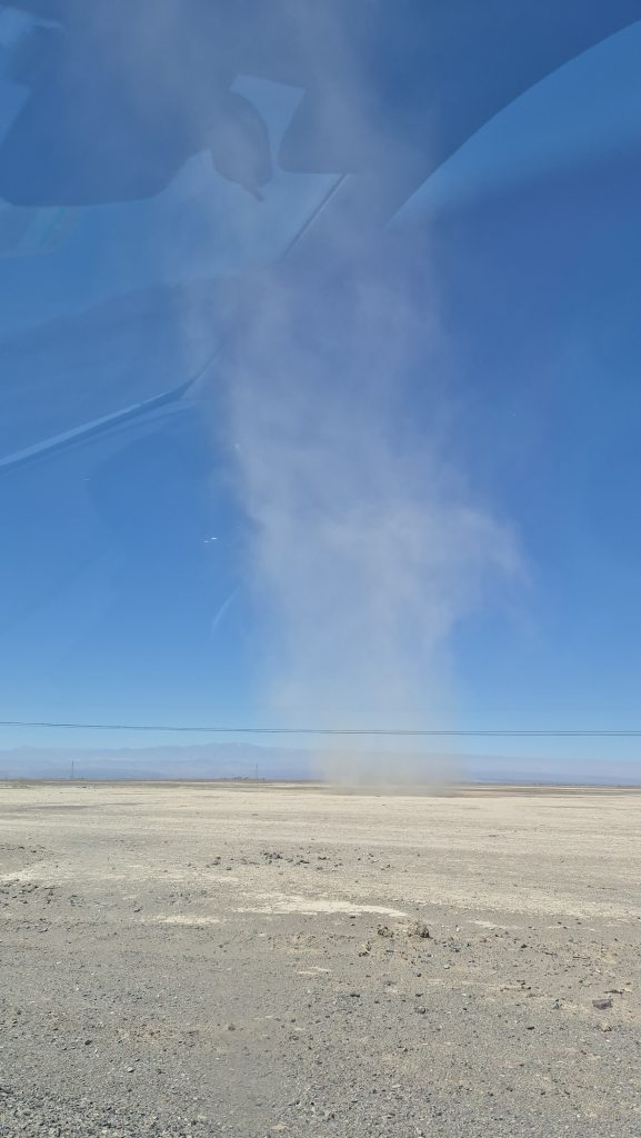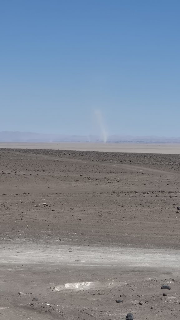 Our next stop was totally different – Gigante de Tarapaca, or, the Tarapaca Giant, a ‘pre-Inca anthropomorphic figure of 86 metres long’ drawn on a hill in what seemed like literally the middle of nowhere. On the way across the plain to the site, we noticed lots of what appeared to be mini ‘sand tornadoes’. A little research revealed that this area has the highest documented ‘dust devil’ formations rates in the world at around 30 to 40 devils per square kilometre per day (apparently).