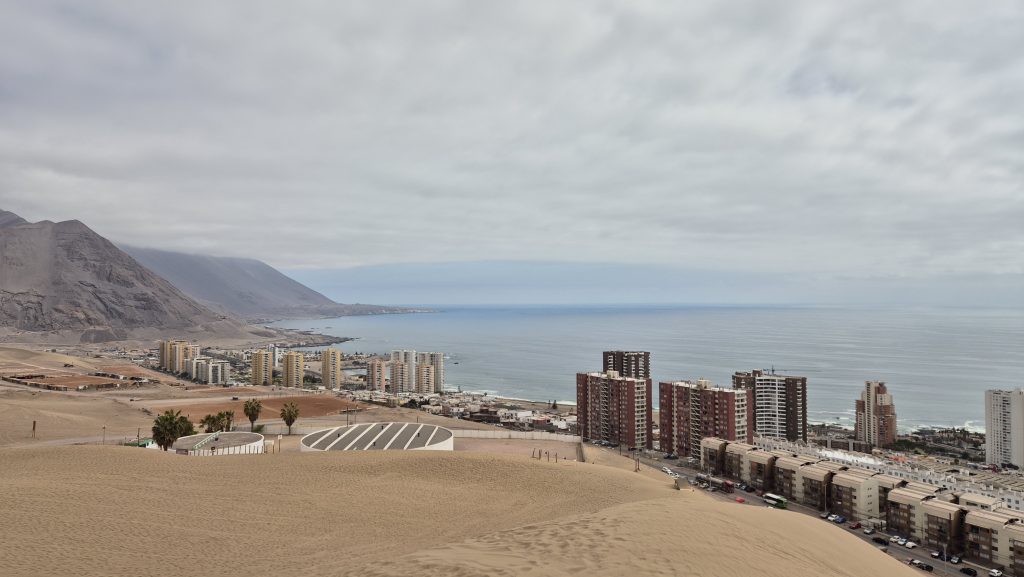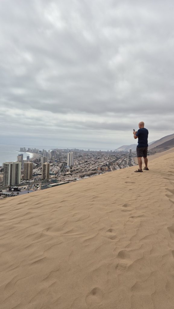 Iquique seems a relatively comfortably financed town. Not wealthy, but a smart seafront, tidy houses and an obvious sense of pride from it’s inhabitants who were constantly hosing over their cars, grass and frontages. Mind you, it is also a sand-dusty place, possibly due to the Cerro Dragon (Dragon Hill) which is the ‘largest relict urban dune on the planet’ (according to Wiki), relict meaning ‘a thing which has survived from an earlier period’. Apparently the dune originated about 20,000 years ago. It lies along the mountainside edge of the town and literally towers over it.