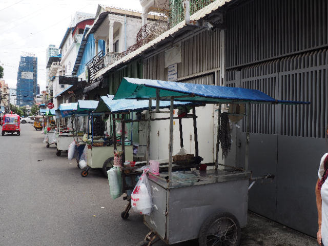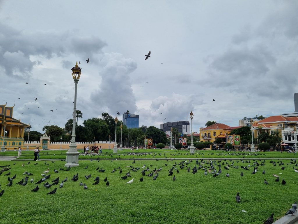 It was a hot and sultry day, with quite a lot of little showers of rain and high humidity so after a stop back at the hotel to cool of a bit (nice air conditioned room), we headed out for the Royal Palace. As always on our walks, we were struck by many interesting street scenes – traffic of all kinds, the differing housing all crammed in together, the street stall ‘parking’, and the many pigeons down on the riverfront.