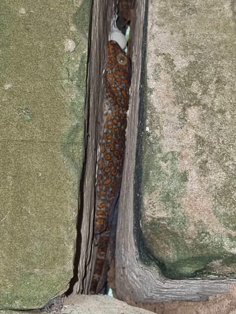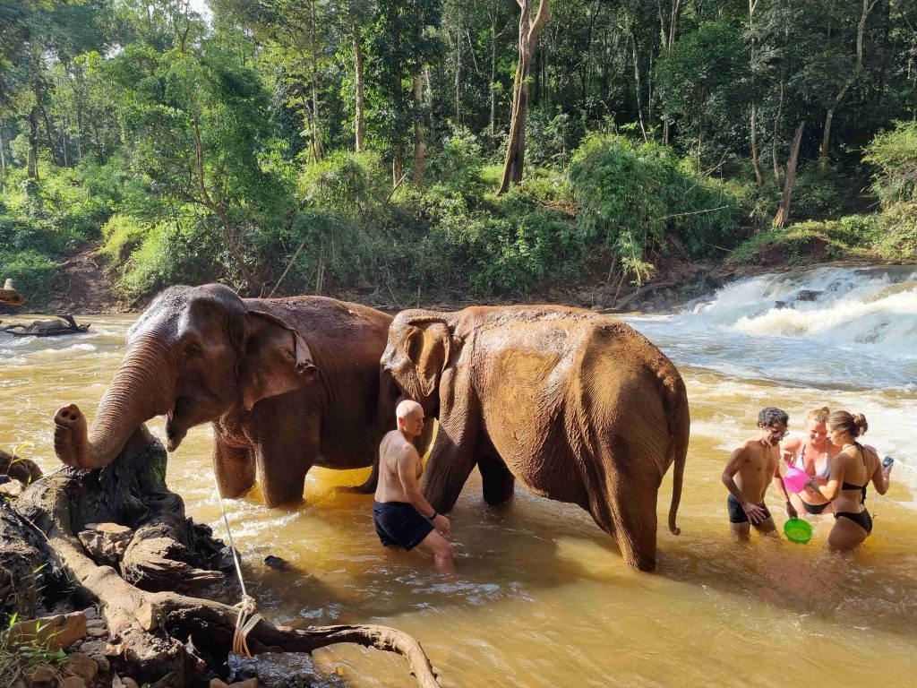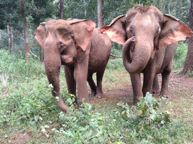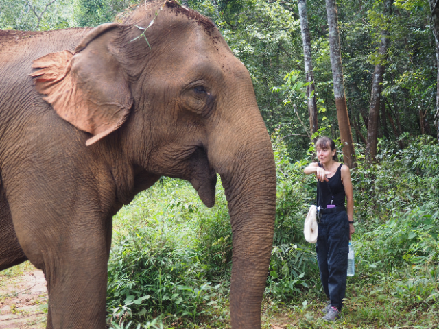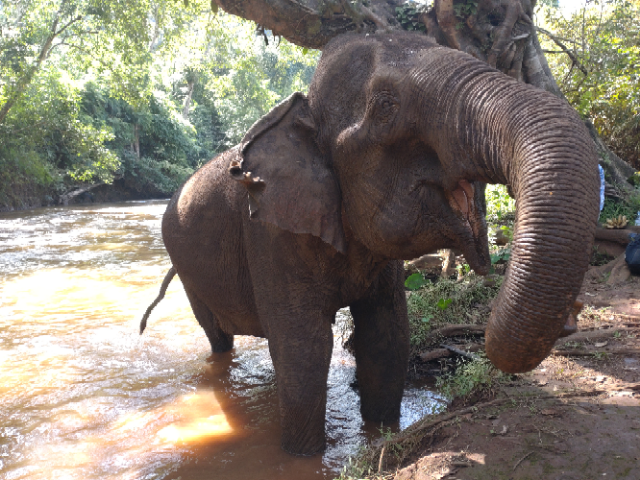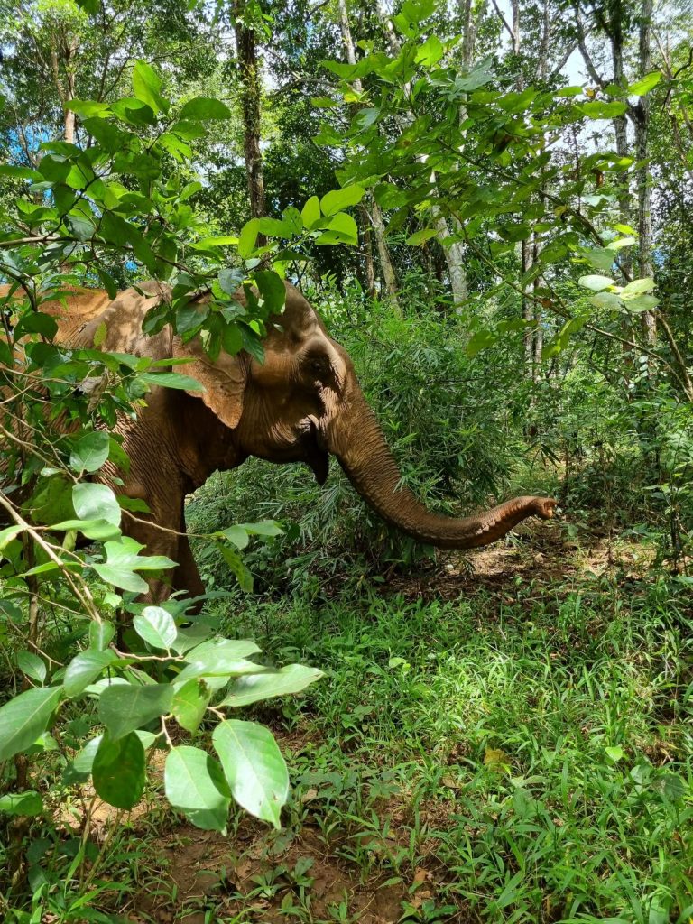 A pick-up truck took us the few kms to the jungle lodge, where we were introduced to our guide Loyin and given a talk about the sanctuary and jungle we were in. The jungle area covers about 1500 hectares and is home to 4 female elephants all rescued from a tough working life after capture, of logging or tourist rides. Two of them had suffered injuries during their working lives and two had just become too old to work effectively and all were badly treated. They have been gradually re-introduced to the jungle and now roam free, no rides, no work, and the ability to forage for themselves and come and go as they please.