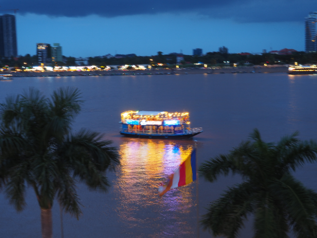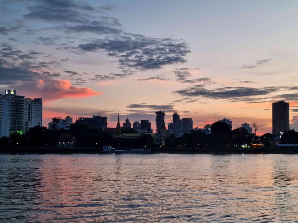 We decided one of our ‘must do’ parts of the trip was to experience a bit more of rural Cambodia, and we also wanted to position ourselves further east and a bit closer to Laos for a later stage of the journey. After some research we picked on Mondul Kiri province (Kiri meaning mountain summit) as it offered hills (Seim Reap, Battambong and Phnom Penh are all pretty flat – think Lincolnshire/Holderness!), jungle, and an opportunity to spend some time at an elephant sanctuary and do a bit of trekking. We picked up a bus to Phnom Penh (5 hr pleasingly uneventful journey) and stayed overnight in a hostel near the bus depot, but also near the river. This meant that a) we changed the age range of the residents significantly 🙂 – which was amusing in its own way; and b) we were able to take advantage of a sunset cruise. This was on the Tonle Sap and Mekong convergence, and this time there was a sunset rather than a downpour.