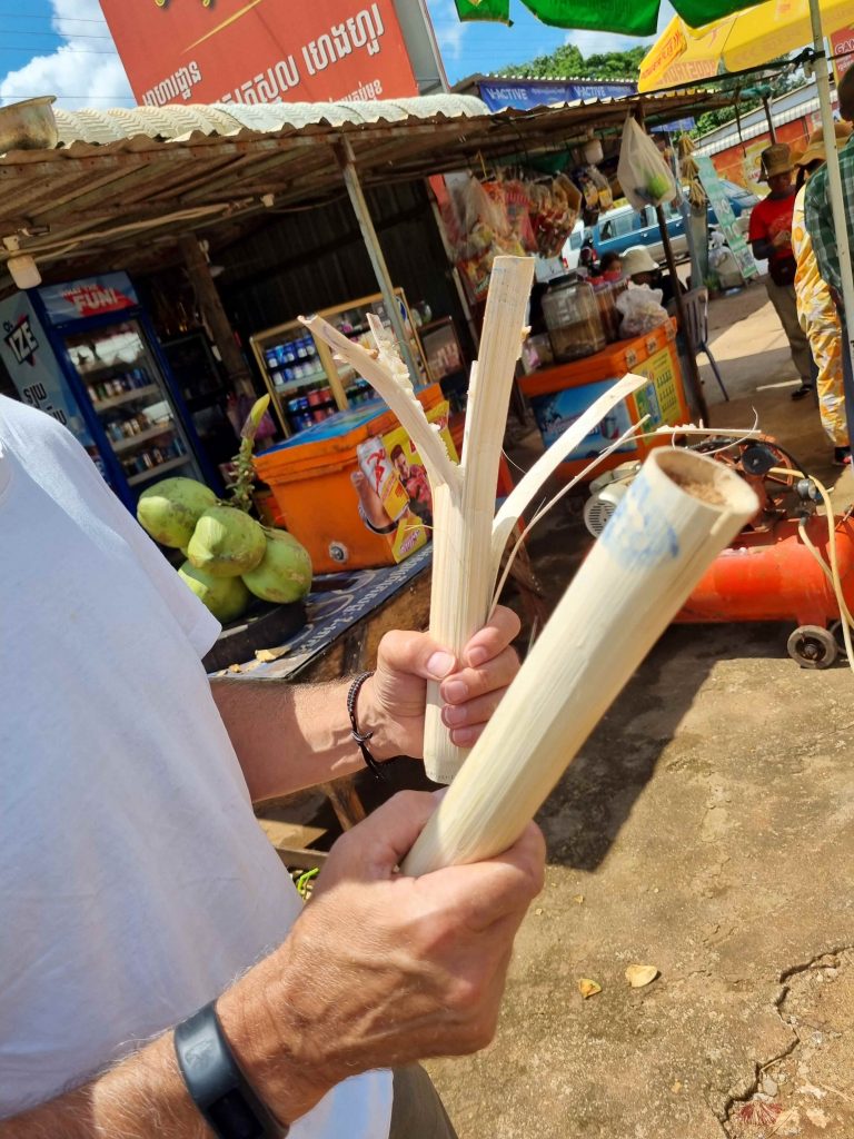 And yes, it’s another 5+ hr journey – no short distances in SE Asia! However, the bus was pretty comfortable, even if the road wasn’t. We had an interesting ‘lunch’ stop and were persuaded by the street food seller to try bamboo sticky rice – which is pretty much what it is – sticky rice stored in a bamboo wrapper which you peel off and break off chunks of rice. It was really nice and made a nice snack.