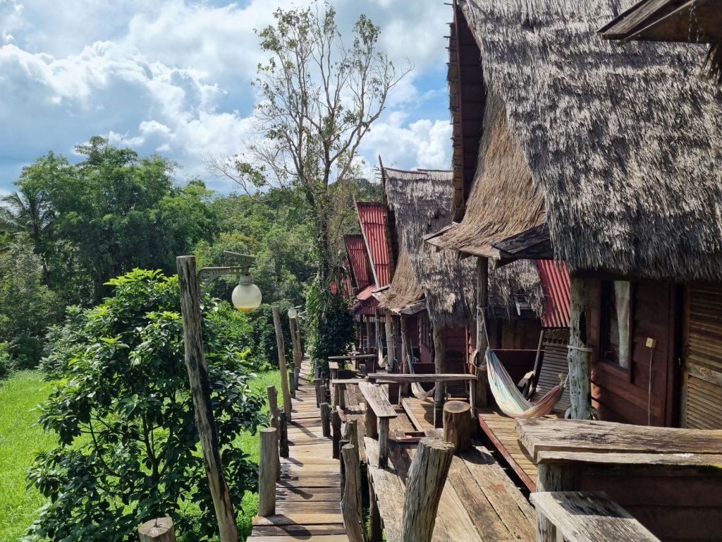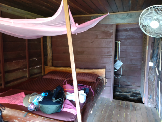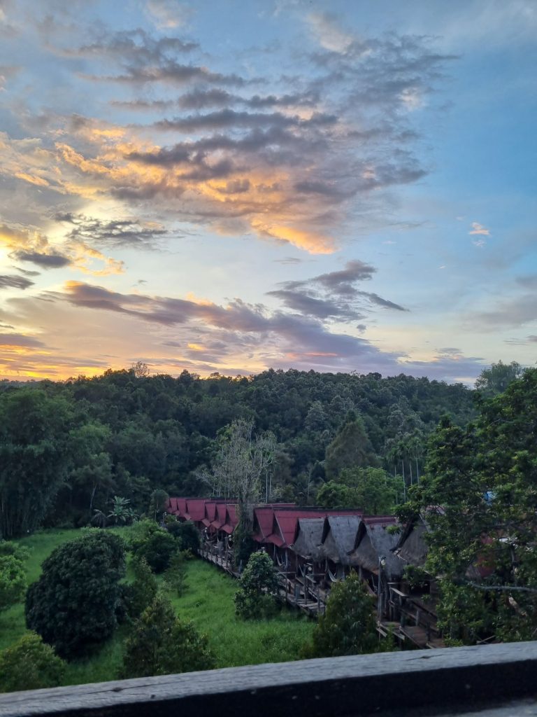 We found our lodgings easily within a shortish walk of being dropped off – Sen Monorom is a pretty small conurbation in comparison to everywhere else we had been and had a quieter and more sleepy attitude – despite the apparent number of guest houses there was definitely no kowtowing to tourists, of whom there seemed very very few. We had booked The Tree Lodge – mainly because this was owned by the same person who had set up the elephant sanctuary so it was easy, and was the pickup point for the tour. We weren’t disappointed by the views and it definitely matched the photos. It was, though, the most basic accommodation we had experienced, so far – wooden huts on stilts and a small wet room which was rather bizarrely floored with large flat rocks laid very randomly so it was like crossing the room on stepping stones to go to the loo (which did flush!). There was nowhere to really put anything and it was easy to drop things between the cracks in the floor boards into the vegetation below, but it had lights, a fan, mosquito net and wifi, along with the most fabulous views, and all you could hear was the insects serenading us.