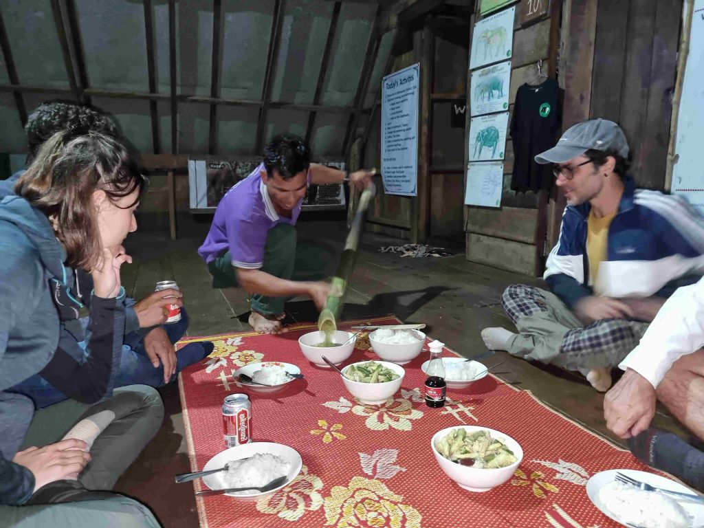 After a day with the elephants, our group divided and the remaining five of us met our guide for the following day, Lone, who cooked our evening meal, showing us how to make bamboo soup. Whilst this cooked, we all headed up the mountain for a spectacular sunset alongside the most incredible display of a lightening storm, accompanied by swifts and bats scooping up the dusk insects.