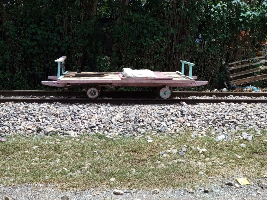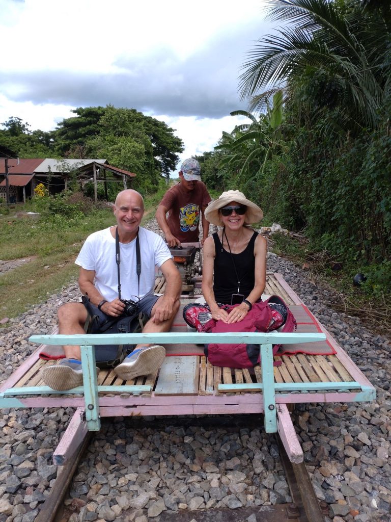 Next stop was the ‘Bamboo Train’. The Khmer Regime destroyed the railway line between Cambodia and Thailand so locals had no way to transport heavy goods from one community to the next. Shortly after the regime ended, they salvaged part of the route and built bamboo flat bed trucks which they poled along the line with a bamboo stick. They still use this as a method of transport but nowadays have small motors on the flat trucks to power them and have developed it as a small tourist activity to help support the local community. We had a trip along the track and back on one of the flat beds and rattled through rice fields, vegetation and over bridges at what felt like a very fast speed but was probably only about 25km/hr – fast enough though! It was very scenic and a great way to stay cool in the breeze.