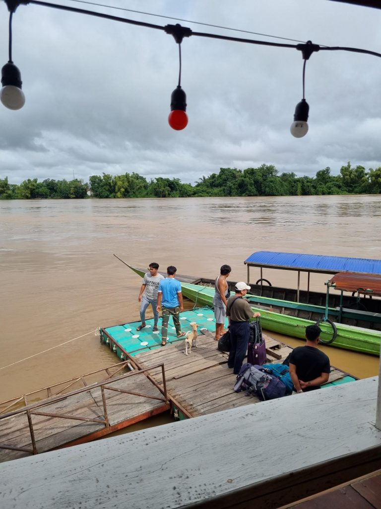 Nope – a wooden plank walkway onto a plastic floating platform and then throw your luggage into the boat (where it hopefully lands) and scramble in after it. After this exciting step, we were then told we were in the wrong boat and had to then scramble into the even smaller one next to it. All rather confusing and definitely a challenge, but safely accomplished amidst laughter and smiles – after all, life on the river is an everyday thing for 4000 Island inhabitants come rain or shine – and this was definitely RAIN! (the ferryman baled out the boat for a good 10 minutes before we set off!)