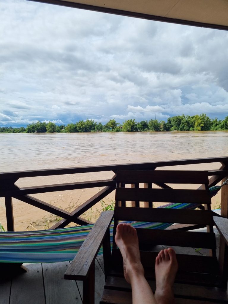 Once through the somewhat confusing visa process we were stamped into Laos and taken by a bus to Nakasong to get the ferry to Don Det where we had booked a couple of nights in a riverside guesthouse to kick back and rest a bit. Whilst on the short route to Nakasong, the increasingly black skies over us decided to let go and our usual theme of arriving in a downpour continued.