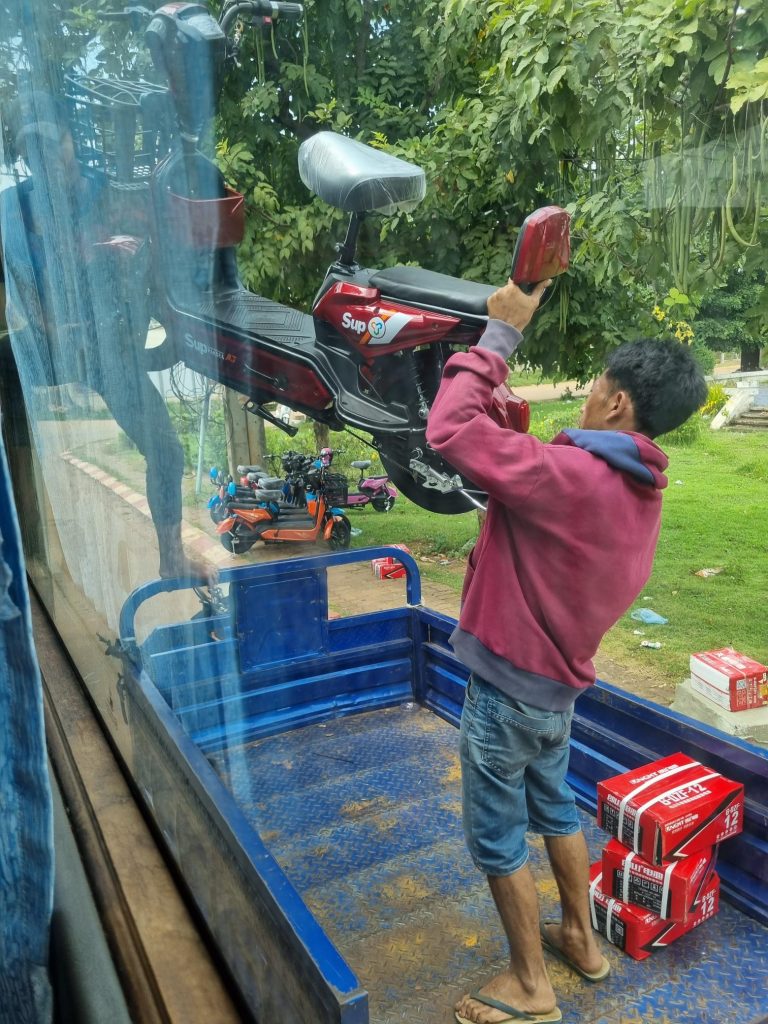After about 20 mins of driving through Pakse – 8 electric mopeds were added. These were put on the roof by three of the guys travelling on the bus – all very efficient, but in flipflops and bare feet and not a glove between them.