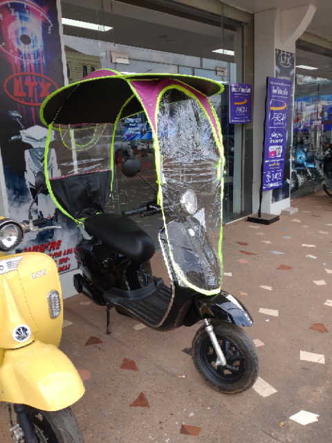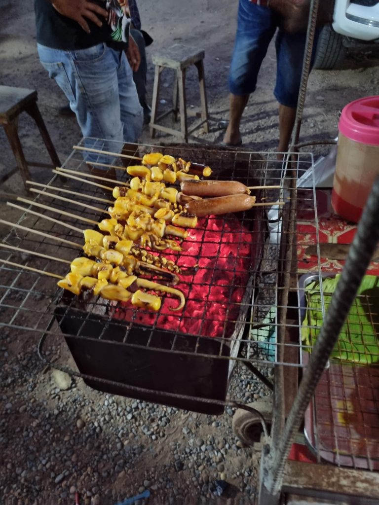 At a food stop where the street food stalls were clean and tidy (which we have seen is the norm in Laos) we grabbed a snack of sausage on a stick and a sort of pizza with salty butter and honey – delicious, Whilst doing this, the electric mopeds were unloaded.