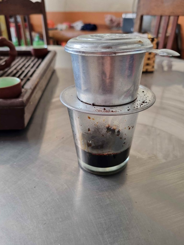 The first coffee was a bit of a disappointment – just a sachet of Nescafe (I guess bus stations are not ‘the place’ to go to for food and drink), but after a bit of a wander around – both to stretch our legs before the journey and just because it is a huge bus station and we were a bit fascinated by it – we were hailed by a cafe owner with a shout of “Kofe”. We thought “why not” and he sat us down with a small egg cup of green tea whilst he created a couple of glasses of drip coffee. We had never seen this done before anywhere on our travels, and he explained, very simply and very proudly, that it was Vietnamese coffee and he was Vietnamese. It has to be said that we are now very much looking forward to Vietnam if this is what their coffee is like!!