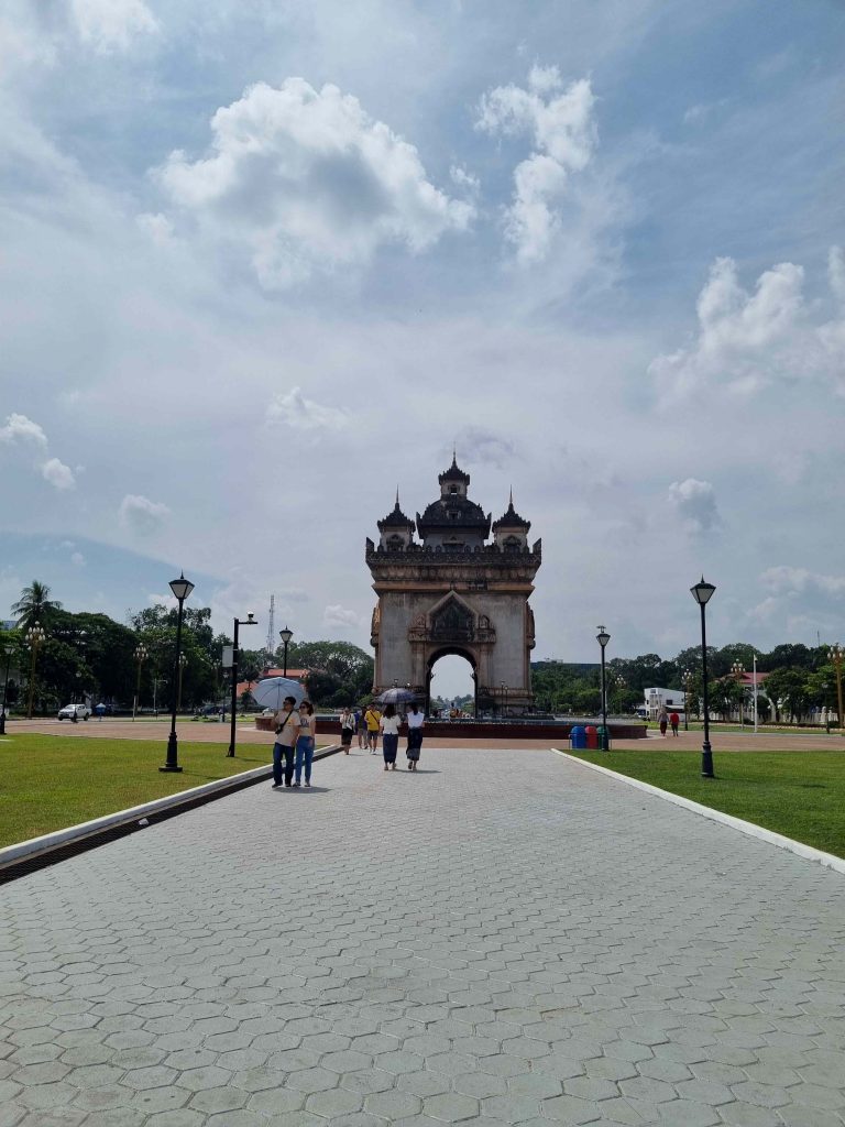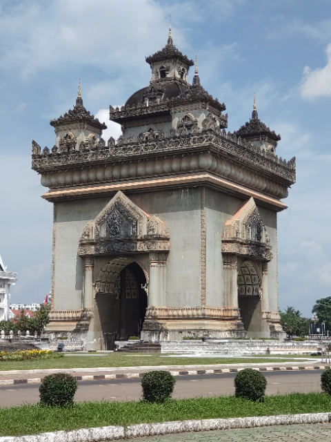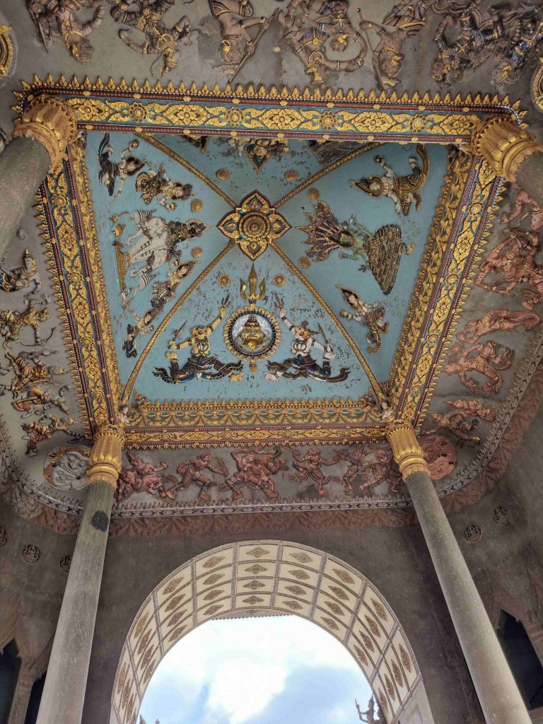 The next sight on our agenda was the ‘Victory’ Arch or Patuxai Arch. It is modelled on the Arc De Triomphe in Paris but with ceilings decorated in Laos style and is in the middle of a large roundabout – fairly busy, but not Parisian busy, so safely negotiated. It was indeed impressive, but unfortunately, the entrance to climb up was closed. The ceiling was really quite something though and worth the mad dash across the roundabout.