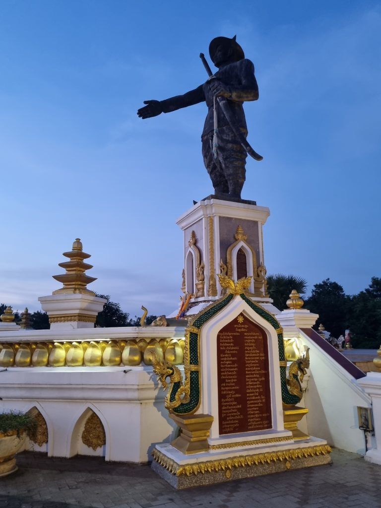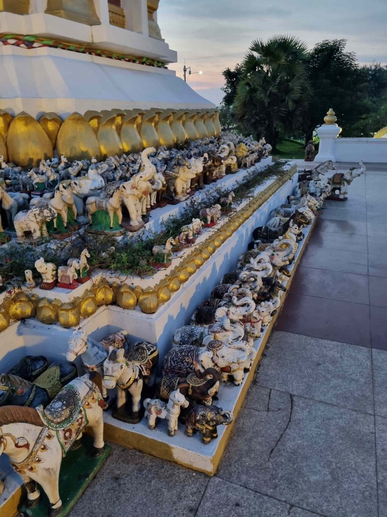 That evening, we wandered out for a sunset over the Mekong and a wander along the riverfront where we encountered the statue of King Anouvong looking out over the Mekong and surrounded by lots of little statues of elephants, horses, then headed to a popular outdoor food court used by the locals where we managed to cook our way through a Laotian BBQ without too many grimaces from the waiters.