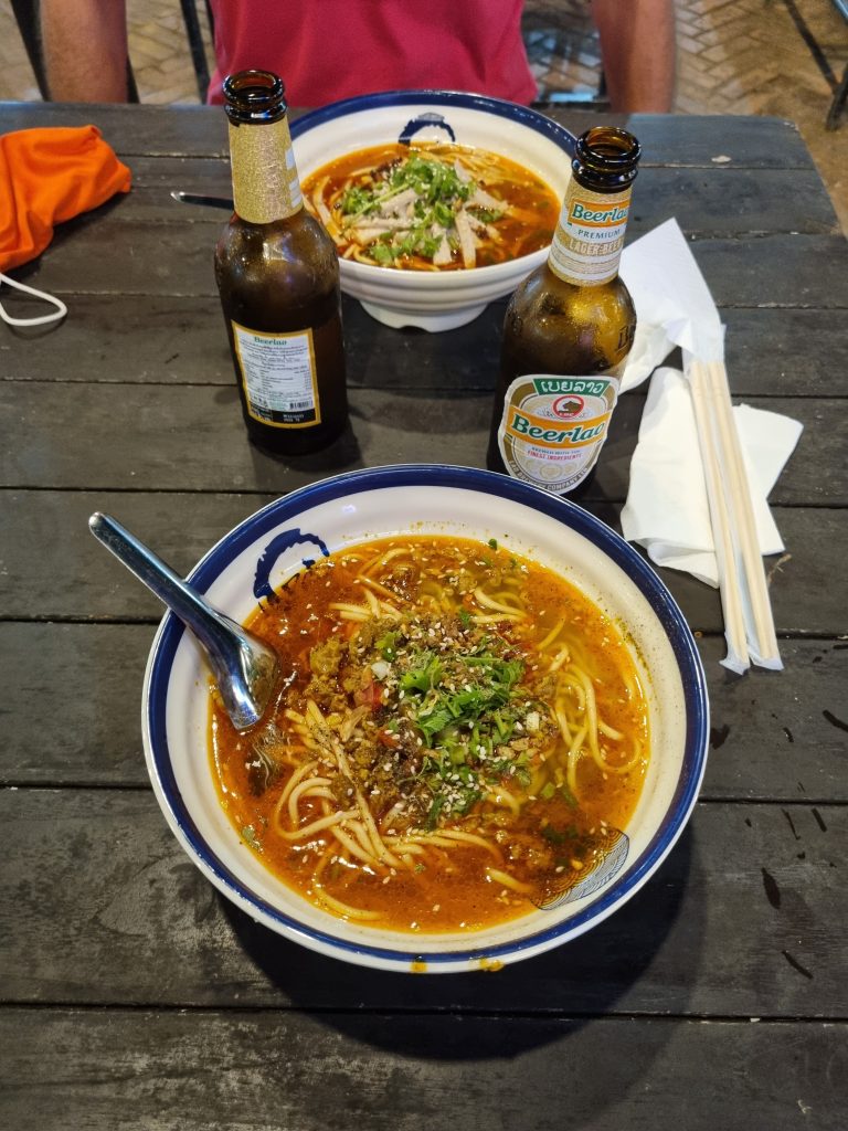 We had a peaceful evening after our first Laotian meal. Although only just across the border from Cambodia, the food is already noticeably different. Much more flavoursome and more varied and also seems pretty cheap. Currency is in kip – 20,000 to 1 USD – and a beer is generally about 20,000 and it feels very strange giving about one hundred thousand of anything to someone to pay for a meal. It’s a bit of a challenge getting used to it.