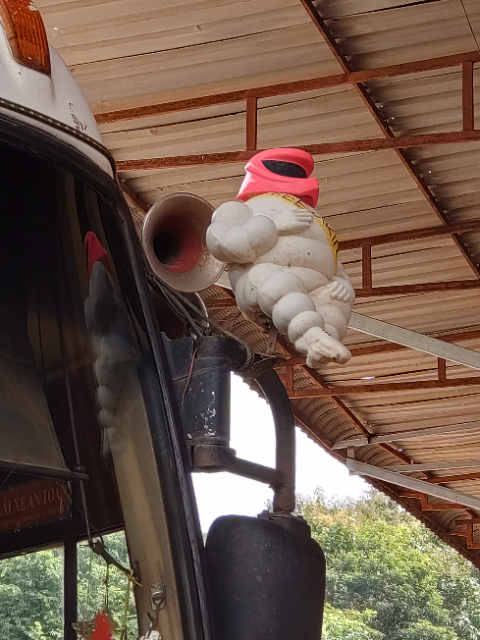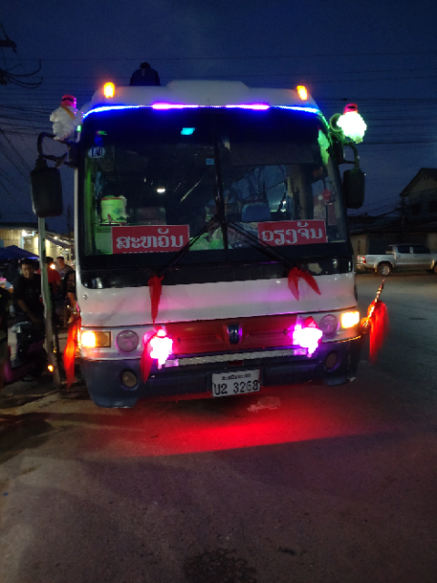 A few more stops, rarely to drop off, only to collect people or luggage or another motorcycle (complete with helmet) again manhandled onto the roof and eventually we got to about a third way through the journey – by this time it was about 5.30pm and beginning to get dark. We realised that we were not going to make Thakhek any time soon.