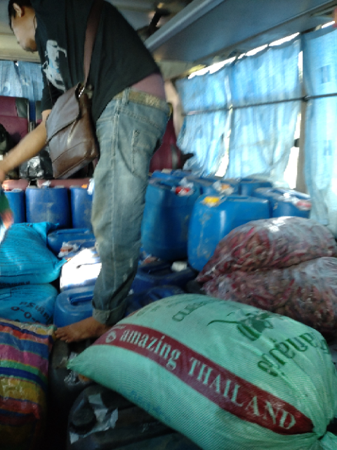At the station – boxes of varying sizes and descriptions and large bags of rice – all into the hold. A few people (about 10 of us in total, with about five of these 10 being the guys who loaded the bus).
