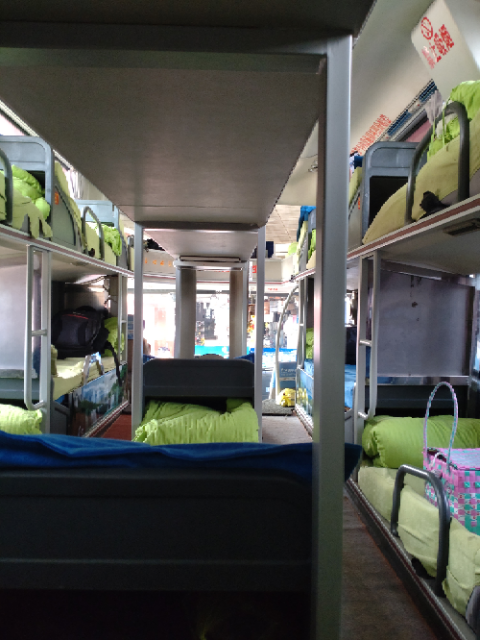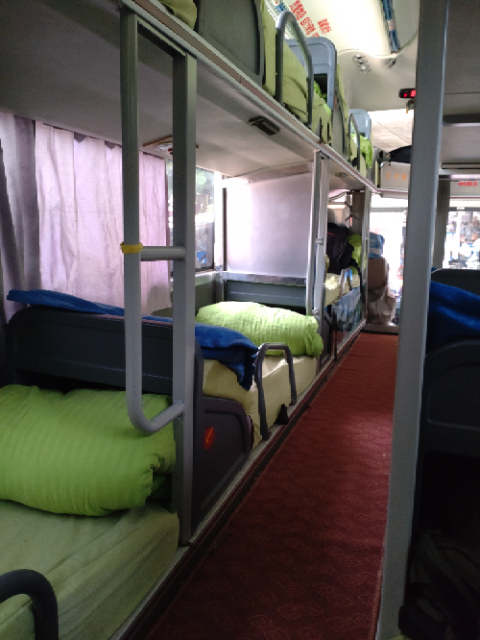 We wandered back to the where we had been told the bus was going from and were pointed in the direction of a large sleeper bus. Not what we had expected, but we duly loaded our bags into the hold and got on board. This was another new experience for us. Three rows of ‘bunk’ beds across the bus with a narrow corridor between each row, and about 8 beds from the front of the bus to the back, where there was a row of about 4 beds. Each had a pillow and a duvet and was a semi-reclined position.