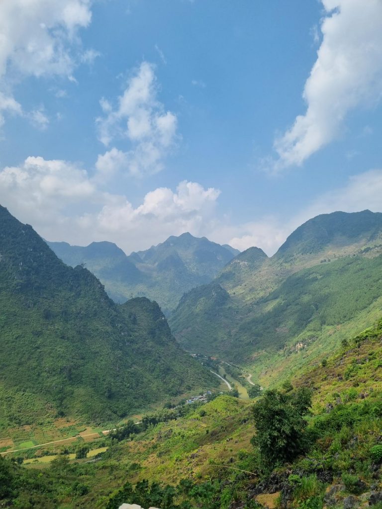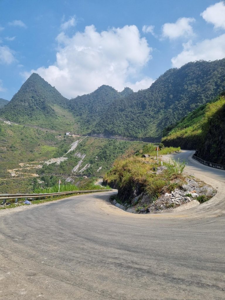 Having had a pretty rough night’s sleep on a particularly brick like bed (the hoteliers in Vietnam seem to have a sadistic approach to mattress choice), we had a strong coffee and Banh Mi (baguette type sandwich which is very popular in Vietnam) and set off on the DT172 towards Meo Vac – our first stop point for the day. This road would allow us to avoid the allegedly vertiginous main road out of Dong Van and thus also avoid much toe curling and eye shutting anxiety on the back of the bike. However, road works stopped play and although we had initially enjoyed the virtually empty and very picturesque road, it got more and more rough, covered with small boulders, and seemingly prone to small landslips. Eventually we agreed that we didn’t want to be stuck in the middle of nowhere with a broken bike (it was getting that rough), so we turned back to Dong Van. Two options remained – return to Ha Giang the way we had come, or go for the route ‘carved into the mountainside’ along with everyone else. Not wishing to miss the promised views (and also not wanting to repeat any part of the loop) we chose the latter option and, despite misgivings, it was actually a stunning ride.