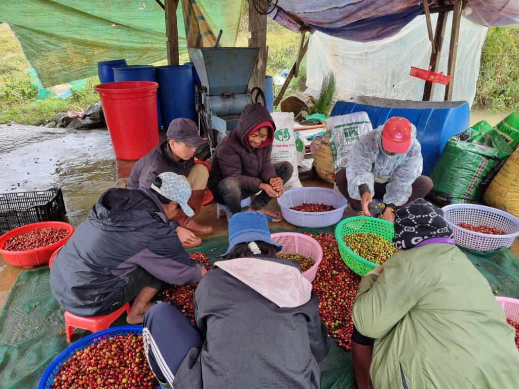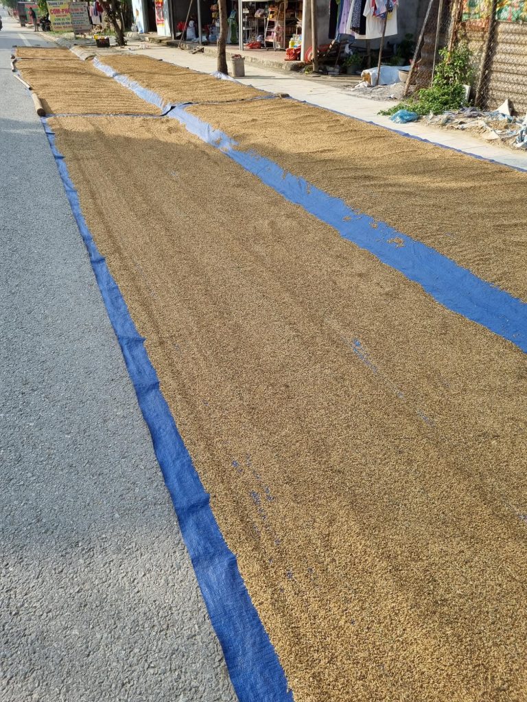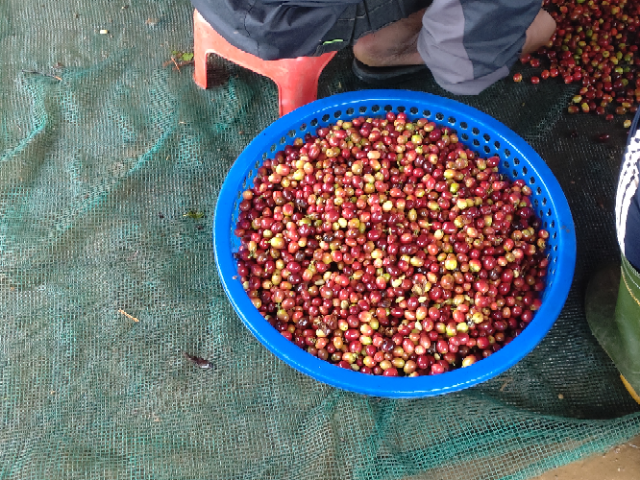 After 20 minutes of splashing through potholes, bouncing over rocks and very off-road tracks we arrived at a hut in the plantation where our guide, Dala, talked to us about how the K’Ho cooperative is made up of around 40 different families who work the farm together. They are currently trying to develop new varieties of coffee plant that will be better able to stand up to the effects of global warming – a task that takes about four years before results will be seen. We were shown how to recognise and pick ripe cherries, then tasked with picking around 250g each – not easy task when all the ripe cherries are hidden amongst the under- and over-ripe, and the bushes densely packed with only around 1m space around each, and each is around 1m in circumference! Also, before picking you had to shake the tree to both shake off the water, and the spiders and other creatures on it and in it.