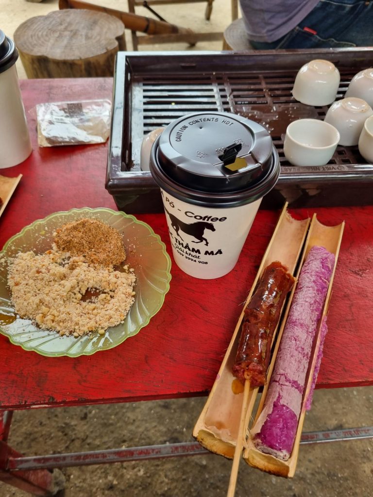 We did rather well with our hotel room – a comfortable bed (at last) and with a view from the balcony (!) of one of the rivers. Bao Lac is quite small in Vietnamese terms, but pretty, and we enjoyed nosing around and drinking coffee and green tea with lemon juice (both delicious – although maybe the ‘snack’ wasn’t quite what we planned on), while planning our next few days in Vietnam.