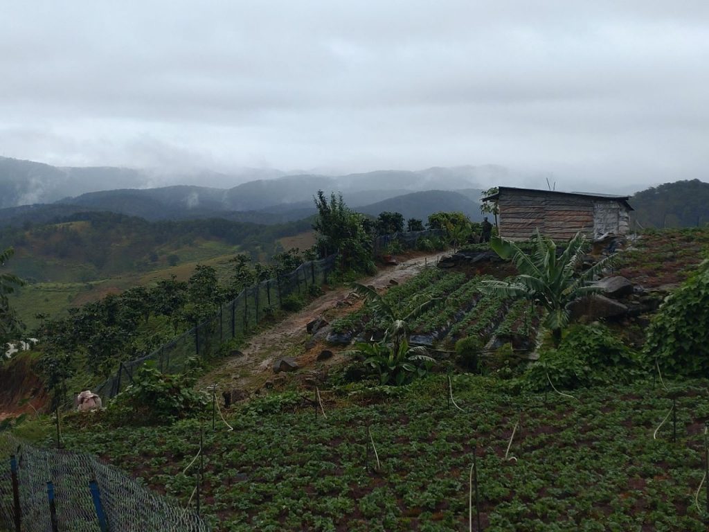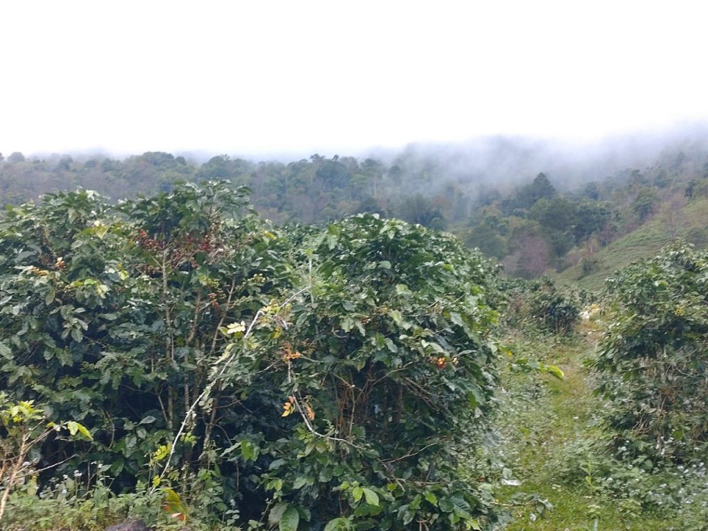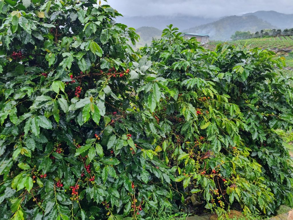Although it was still pouring with rain, the scenery was mesmerising. Alpine like mountains covered in low cloud and mist with beautiful valleys stretching into the distance. Bright red soil and verdant green trees and bushes surrounded us, and the colourful red and green coffee cherries positively glowed.