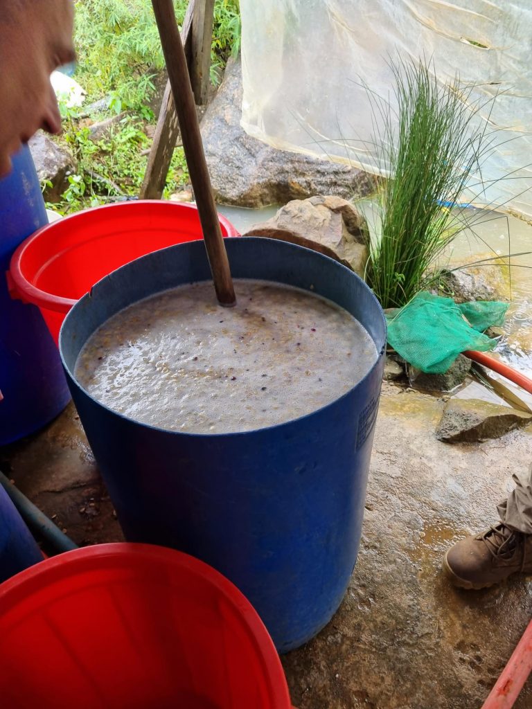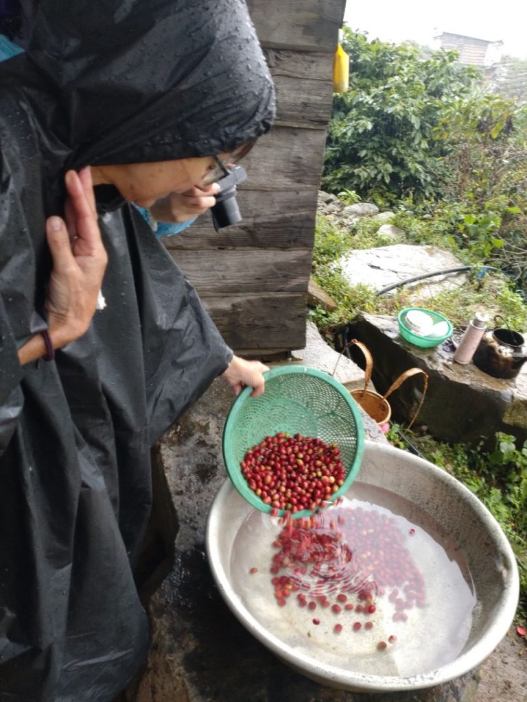 Once enough cherries had been gathered, we were shown how to check for ‘dead’ berries – they float in water, wash them, ‘pop’ them – this means squeezing the berry so the coffee beans inside literally pop out and then sort the ‘dead’ beans out from the good ones.