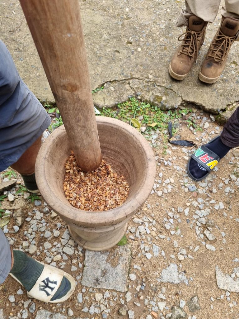 Dried beans are pounded to remove their outer skin and then ‘fanned’ to remove the skins before being roasted to the required light, medium or dark roast required for the flavour needed.