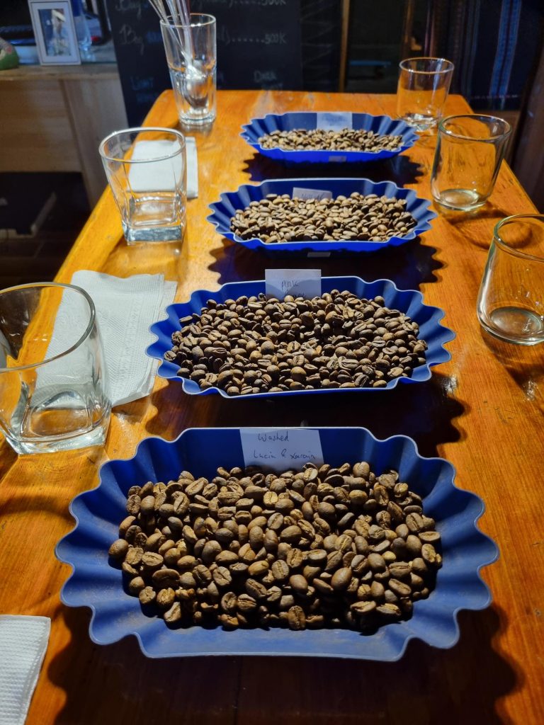 Once we had roasted the beans, we were then challenged to the “cupping” process. There are about eight different aspects to “cupping”, and tasting is probably less than half. It involves sampling the smell and taste the coffee both in bean, ground, and drink form to identify the fragrance, aroma, body etc. Our final challenge was to finally identify which was our favourite from the variety of processing options the beans were put through.