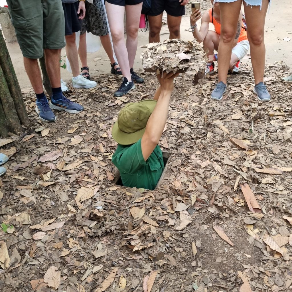 Our first on the list of things of do in and around HCM is the Cu Chi tunnels – used by Viet Cong during the Vietnam war. Research showed that doing the tunnels solo is awkward, and we felt a tour would give us a better understanding so we bit the bullet and hopped onto the tourist trail, significantly increasing the average age of our chosen tour. The tunnels are clearly a major tourist attraction, as observed by the huge number of coaches and the QR ticket scanners in the access route. The tunnels themselves were built by the Viet Cong during the war and total 250km, running underneath the jungle linking up many strategic points. There was even a leg which runs down into HCM into a cellar in the city where weapons and vehicles were stored – that’s 70km away! Although some utilised tunnels farmers had dug during WW2 to hide food from the Japanese military, the majority were built during the early part of the Vietnam war. More incredible is that they were dug by hand with small hoes, the spoil being removed in bamboo baskets and dumped in the river – there was much ingenuity in their design, providing deeper shelters to hide from bombing, and decoys to divert and confuse. Many were booby trapped and the traps were horrific.