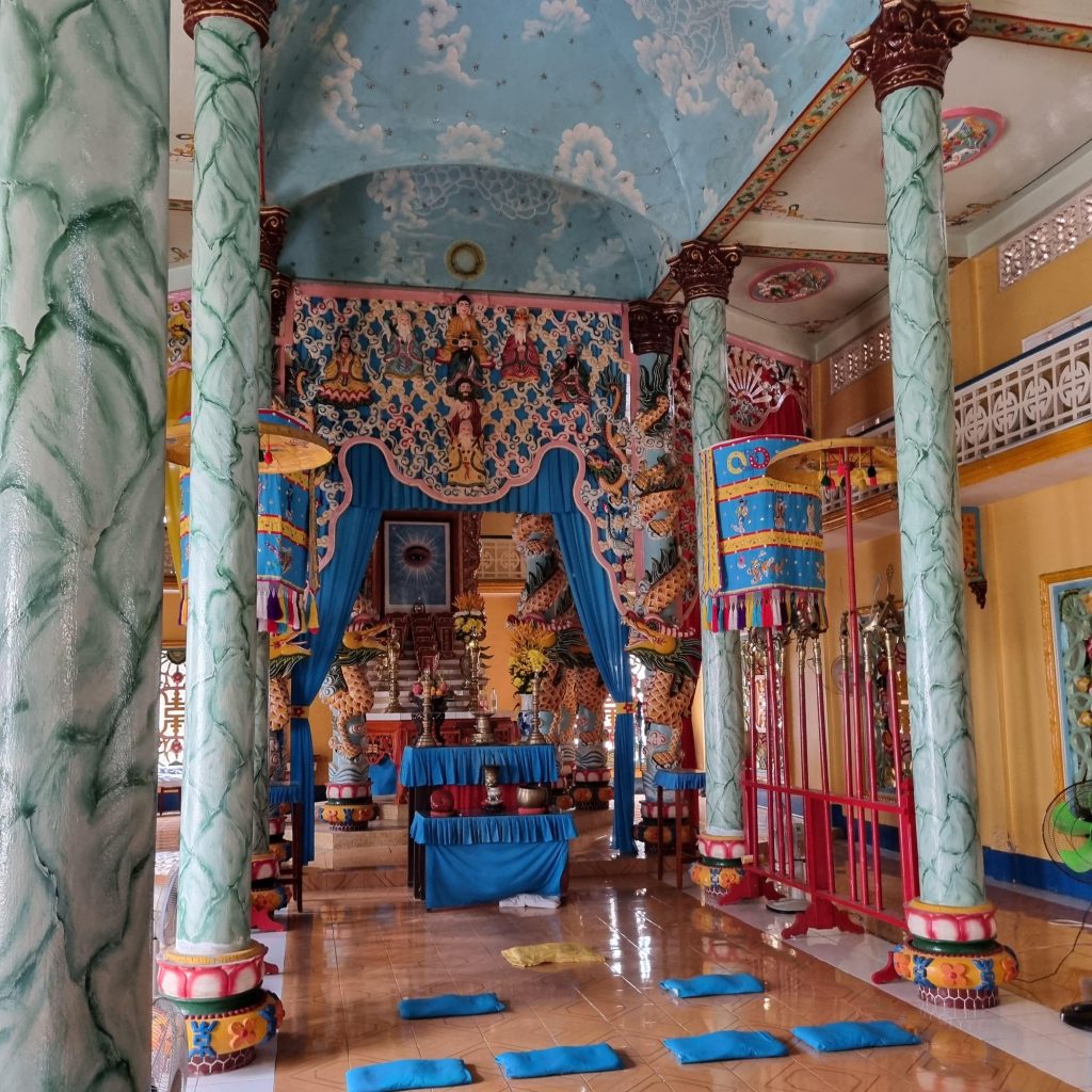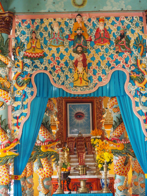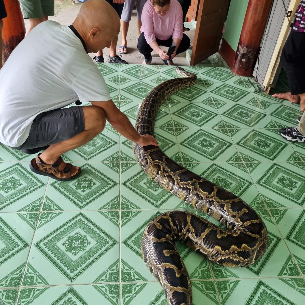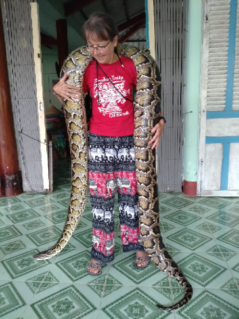 We were not disappointed and enjoyed a day with a small group and an excellent guide, speeding around the waterways from Ho Chi Minh to the Mekong in a speedboat. We did have some land-based interludes, such as visiting a small-holding of a Vietnamese family who also owned a rather hefty python – 42kg!; a couple of temples – one Buddhist and one Cao Dai (a relatively new, and seemingly burgeoning, religion which takes the most positive aspects of several other religions such as Buddhism, Daoism and Confucionism, and also a bit of Christianity) and a local market – definitely not tourist-focussed. We enjoyed a really delicious lunch including Elephant Ear fish as the centre piece – a first for all of us, but the joy for us, was seeing how people lived and worked with the Saigon River and it’s waterways and how these all ran into the Mekong and on to the South China Sea. The photos tell the story (although they cannot convey the smell which was a little pungent on occasion…..)